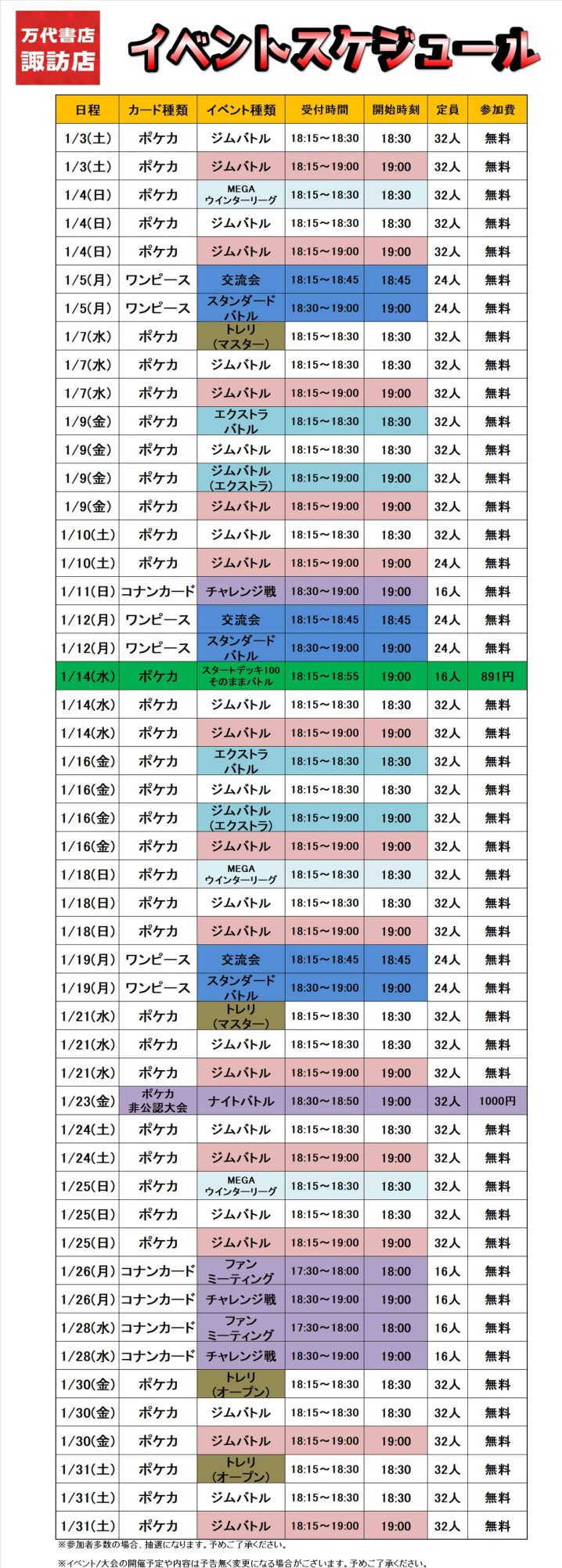 カード担当からお知らせ✉️ 1月のイベントスケジュールになります。 イベント開催日の際は、デュエルスペースのご移動ご協力をお願い致します。 イベント/大会の開催予定や内容は予告無く変更になる場…