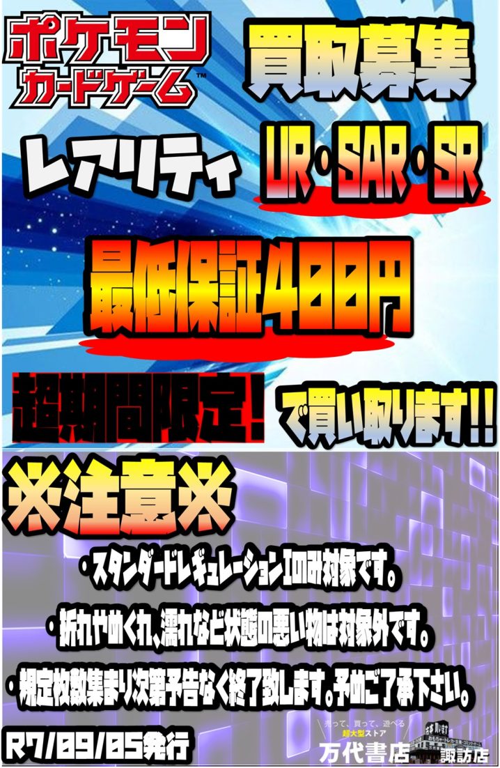 突然ですが緊急買取告知です! SR、UR最低保証の200円から期間限定で400円で買取します! 大量持ち込みも勿論OK! 尚、対象はレギュレーションIのみでありその他レギュレーション(G.H)は通常通り200円となります…