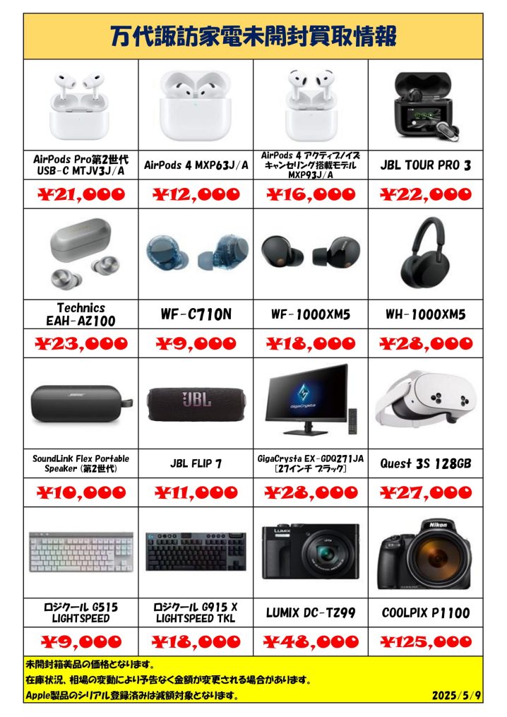 今月の家電買取チラシを更新しました。📣 未使用・中古問わず買取しておりますので、是非お持ちください! ※2025/5/10現在の価格となります。 在庫状況・状態によってお値段が変動いたします。予めご了承く…