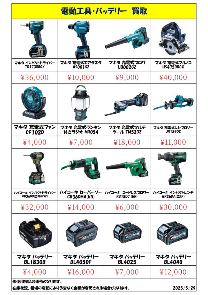 電動工具の買取チラシを更新しました。 乗っていない商品も買取いたしますので是非お持ちください! ※2025/5/30現在の価格となります。 在庫状況・状態によってお値段が変動いたします。予めご了承ください。 ******…