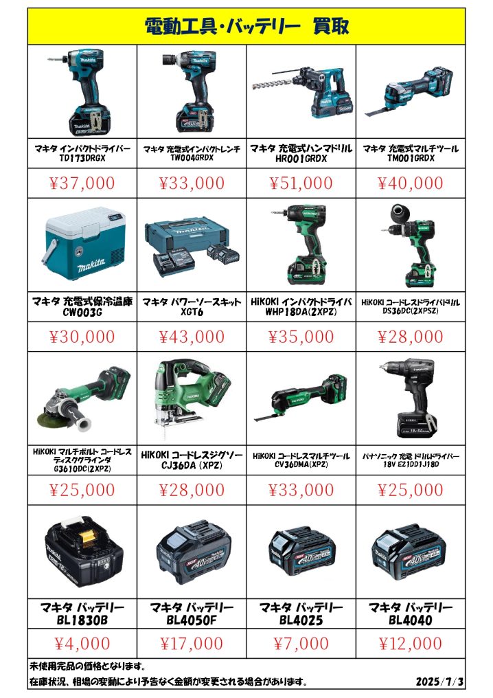 電動工具の買取チラシを更新しました。 乗っていない商品も買取いたしますので是非お持ちください! ※2025/7/4 現在の価格となります。 在庫状況・状態によってお値段が変動いたします。予めご了承ください。 ******…