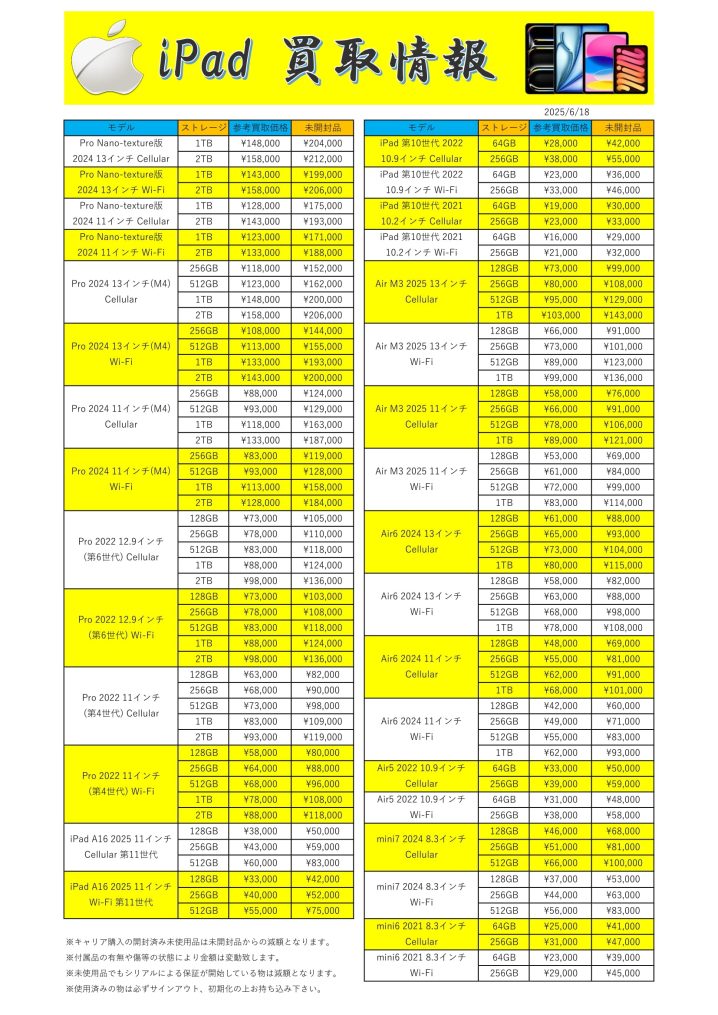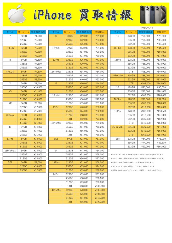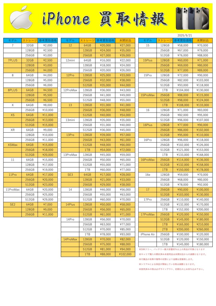 iPhone、iPadの買取リストを更新いたしました。 チラシに載っていない商品も気軽にお持ちください! ※2025/7/19現在の価格となります。 在庫状況・状態によってお値段が変動いたします。予めご了承ください。 *…