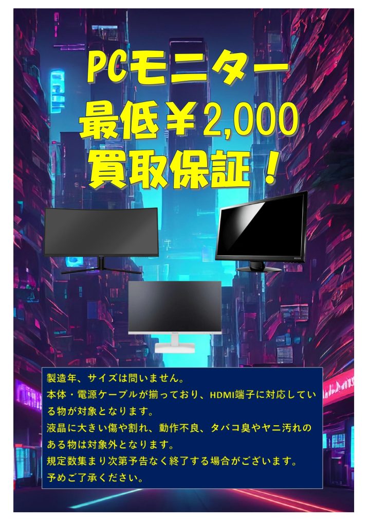 PCモニターの買取を強化いたします! HDMI対応機種で本体・電源ケーブルが揃っていれば最低2,000円保証! この機会に買い替えて要らなくなったモニターを是非お売りください! ※2024/12/24現在の価格となります…