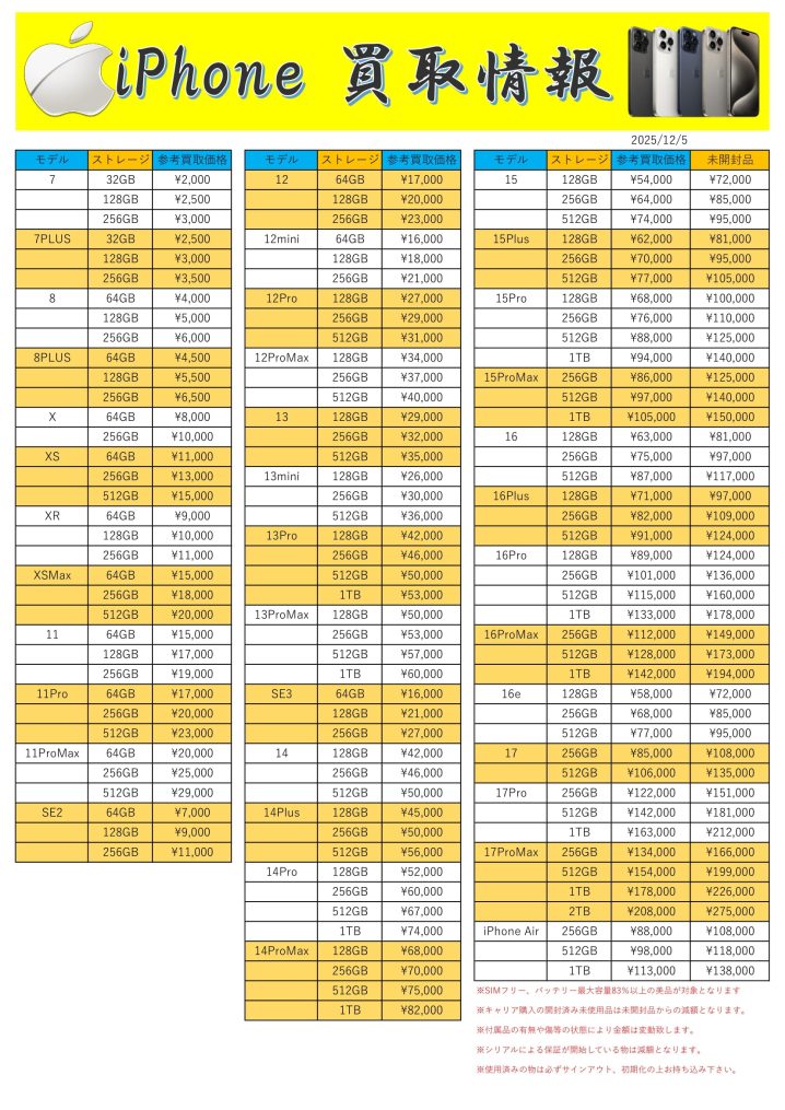 ★iPhoneリスト更新★ 間が空いてしまいましたがiPhoneの買取リストを更新いたしました。 使わなくなったApple製品気軽にお持ちください! ※2025/12/6現在の価格となります。 在庫状況・状態によってお値…