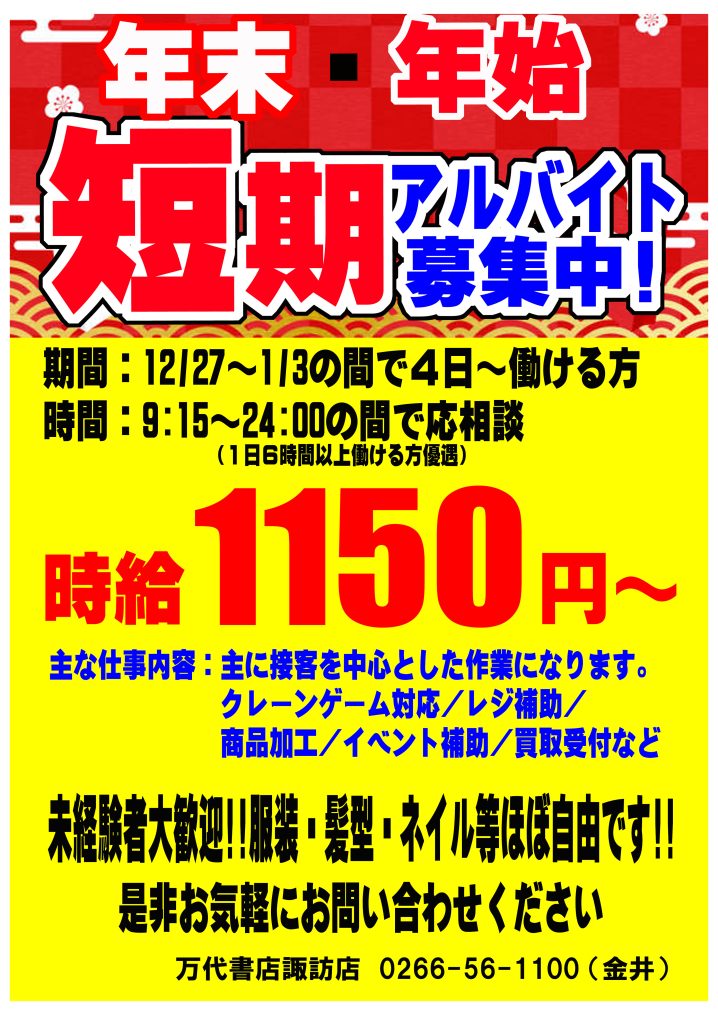 只今、短期アルバイトさんを募集しております。 ご都合が空いている方、いらしゃいましたら、ぜひご応募ください!