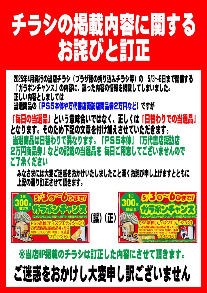 ★GWチラシの掲載内容に関するお詫びと訂正★