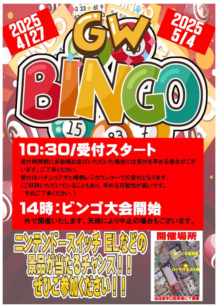 5/4開催 GWビンゴ大会(後半戦)を開催いたします。 景品は画像にてご確認ください! 今回は人数を無制限で開催致します! ただ、ハズレのビンゴカードは クレーンゲームで1クレジットご利用出来ます。ご了承下さい。 ビンゴ…