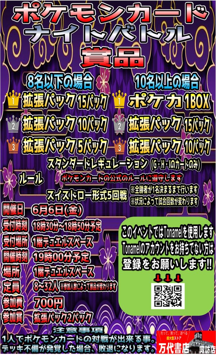 ポケカ担当からお知らせです!📢 みなさん、万代書店諏訪店のナイトバトルにご参加頂き誠にありがとうございます!!🙇 ナイトバトルを開催して1年が経ちました!! 記念として!! 6月13日金曜…