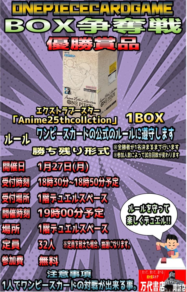 大会告知 ONE PIECE カード担当からお知らせです!📢 突然ですが! 1月27日月曜日に BOX争奪戦を開催します!! 優勝賞品には 『エクストラブースターパック Anime25thcollecti…