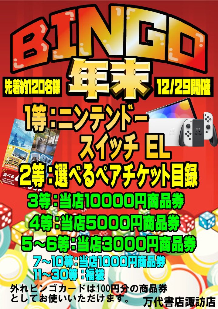 12/29と年明け1/5にビンゴ大会を開催いたします。 様々な景品をご用意しておりますので是非ご参加ください。 参加券配布時間は早まる可能性が高い為予めご了承ください。 たくさんのご参加お待ちしております。 ******…