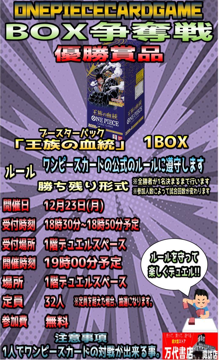 ONE PIECE CARD GAME担当からお知らせです!📢 突然ですが! 12月23日月曜日に BOX争奪戦を開催します!! 優勝賞品には 『ブースターパック 王族の血統1BOX』 をご用意させていた…