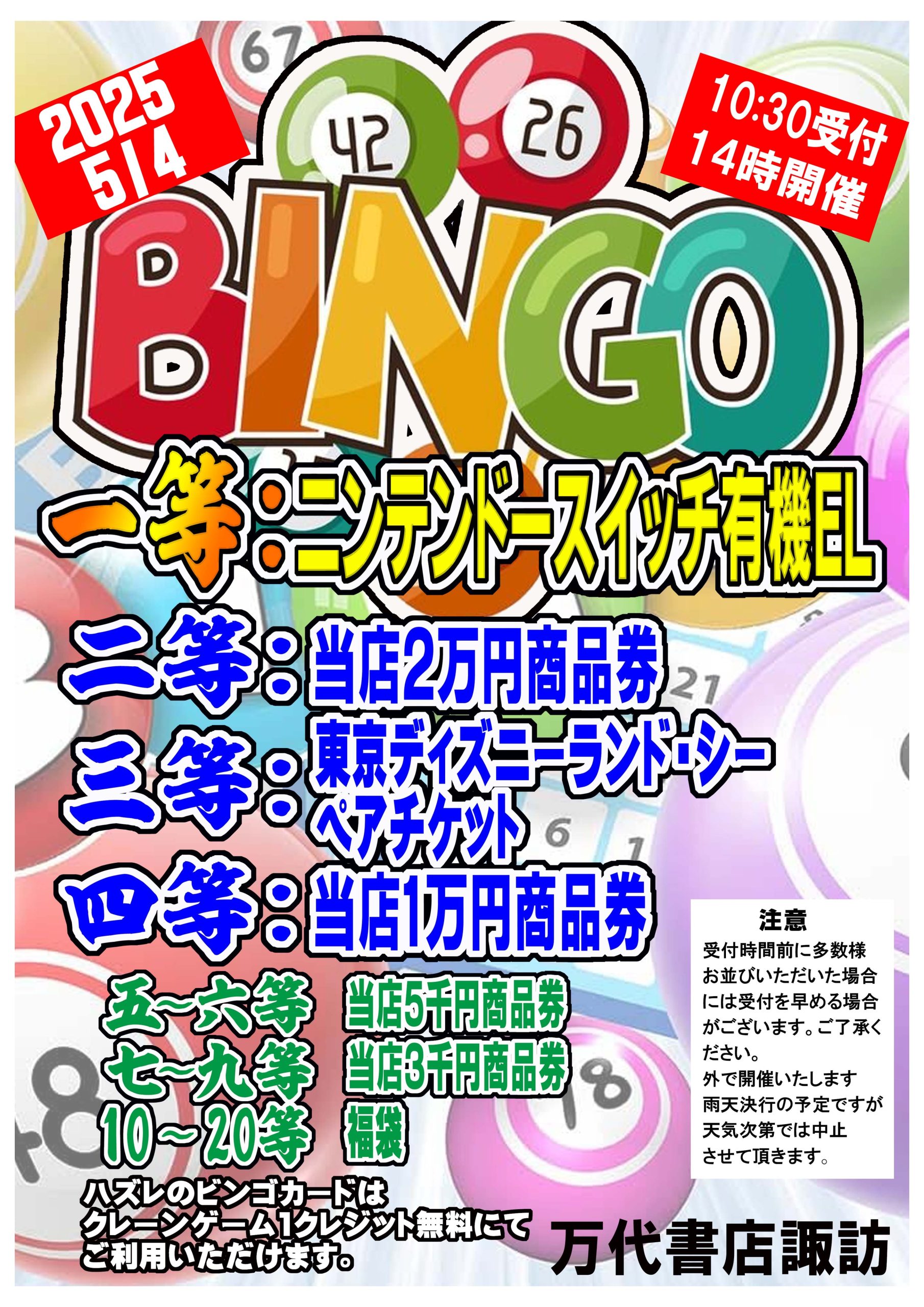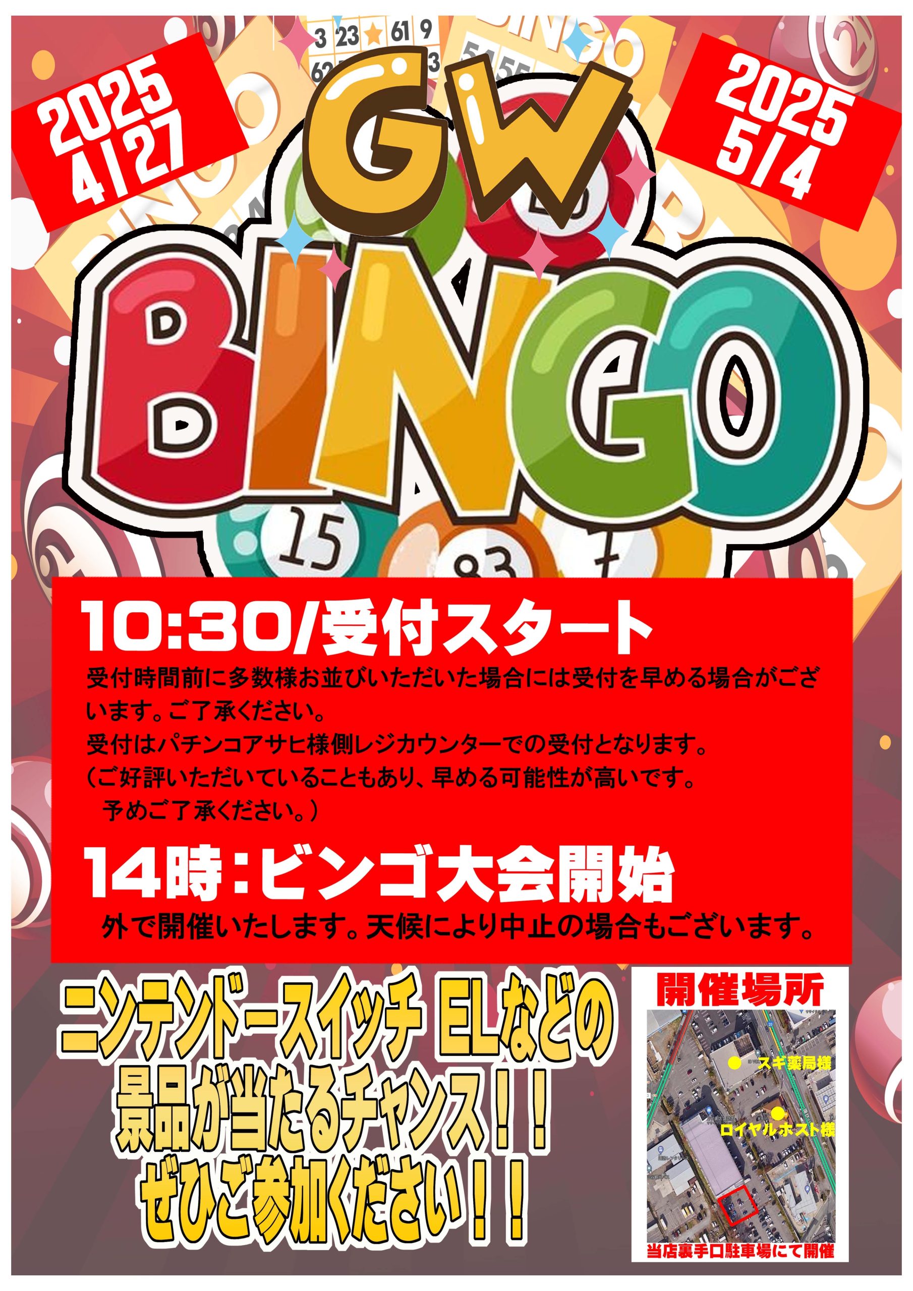 5/4開催 GWビンゴ大会(後半戦)を開催いたします。