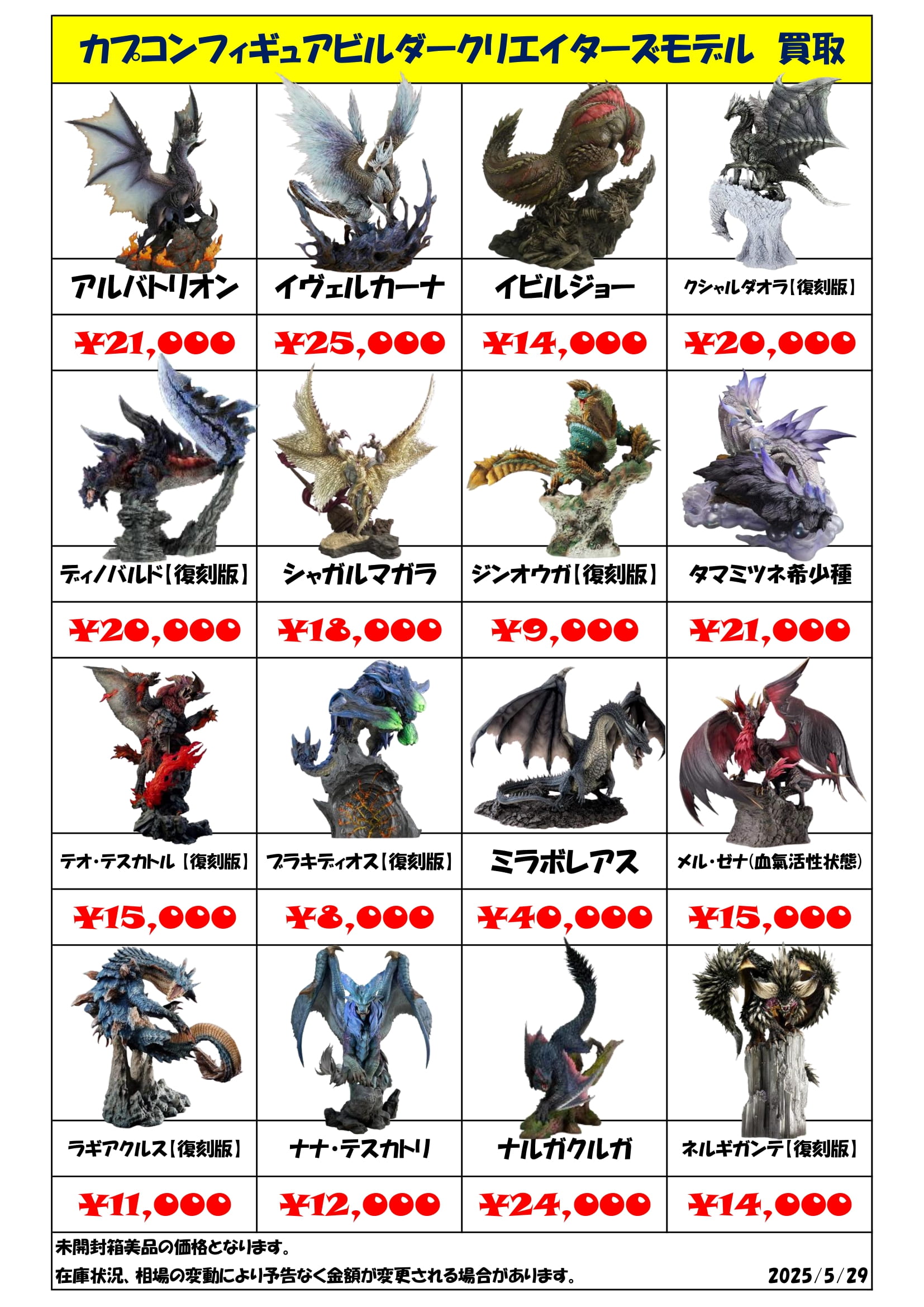 2025.05.30 買取情報 takalab_6 ◆カプコンフィギュアビルダークリエイターズモデル 買取チラシ更新しました!◆ カプコンフィギュアビルダークリエイターズモデルのチラシ更新を行いました。 載っていないものや、スタンダードモデルも買取いたしますので是非お持ちください! ※2025/5/30現在の価格となります。 在庫状況・状態によってお値段が変動いたします。予めご了承ください。 **************** こちら↓もぜひチェックしてみてくださいね♪(*´▽`*) ・最新のイベント情報はこちら ・最新の買取情報はこちら コメントを残す コメントをキャンセルメールアドレスが公開されることはありません。 ※ が付いている欄は必須項目ですコメント ※ 名前 ※ メール ※ サイト 新しいコメントをメールで通知 新しい投稿をメールで受け取る Δ