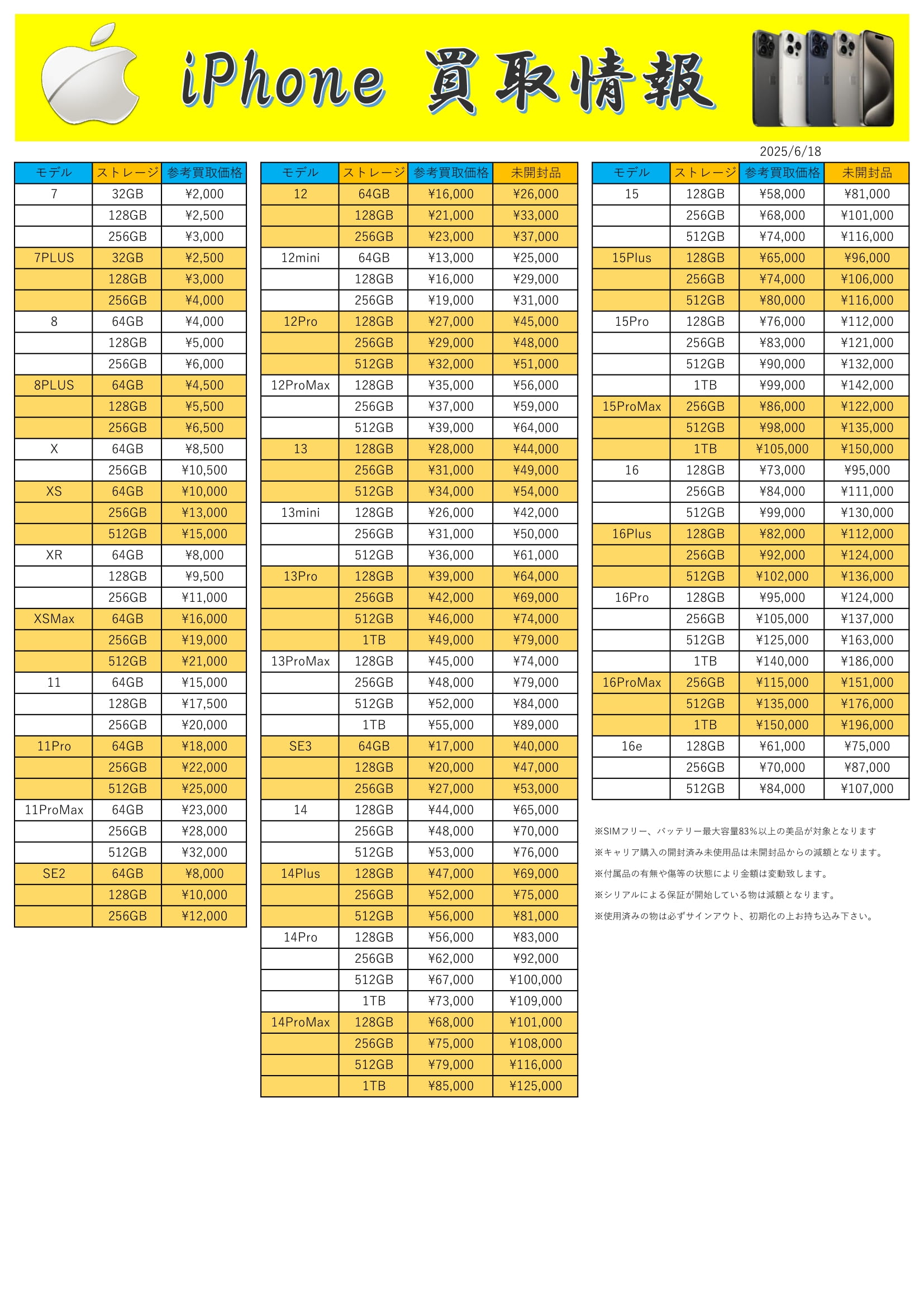 2025.06.19 買取情報 takalab_2 ■iPhone・iPadリスト更新■ iPhone、iPadの買取リストを更新いたしました! 機種変更で使わなくなった端末等買取いたしますので是非お持ちください! ※2025/6/19現在の価格となります。 在庫状況・状態によってお値段が変動いたします。予めご了承ください。 **************** こちら↓もぜひチェックしてみてくださいね♪(*´▽`*) ・最新のイベント情報はこちら ・最新の買取情報はこちら コメントを残す コメントをキャンセルメールアドレスが公開されることはありません。 ※ が付いている欄は必須項目ですコメント ※ 名前 ※ メール ※ サイト 新しいコメントをメールで通知 新しい投稿をメールで受け取る Δ