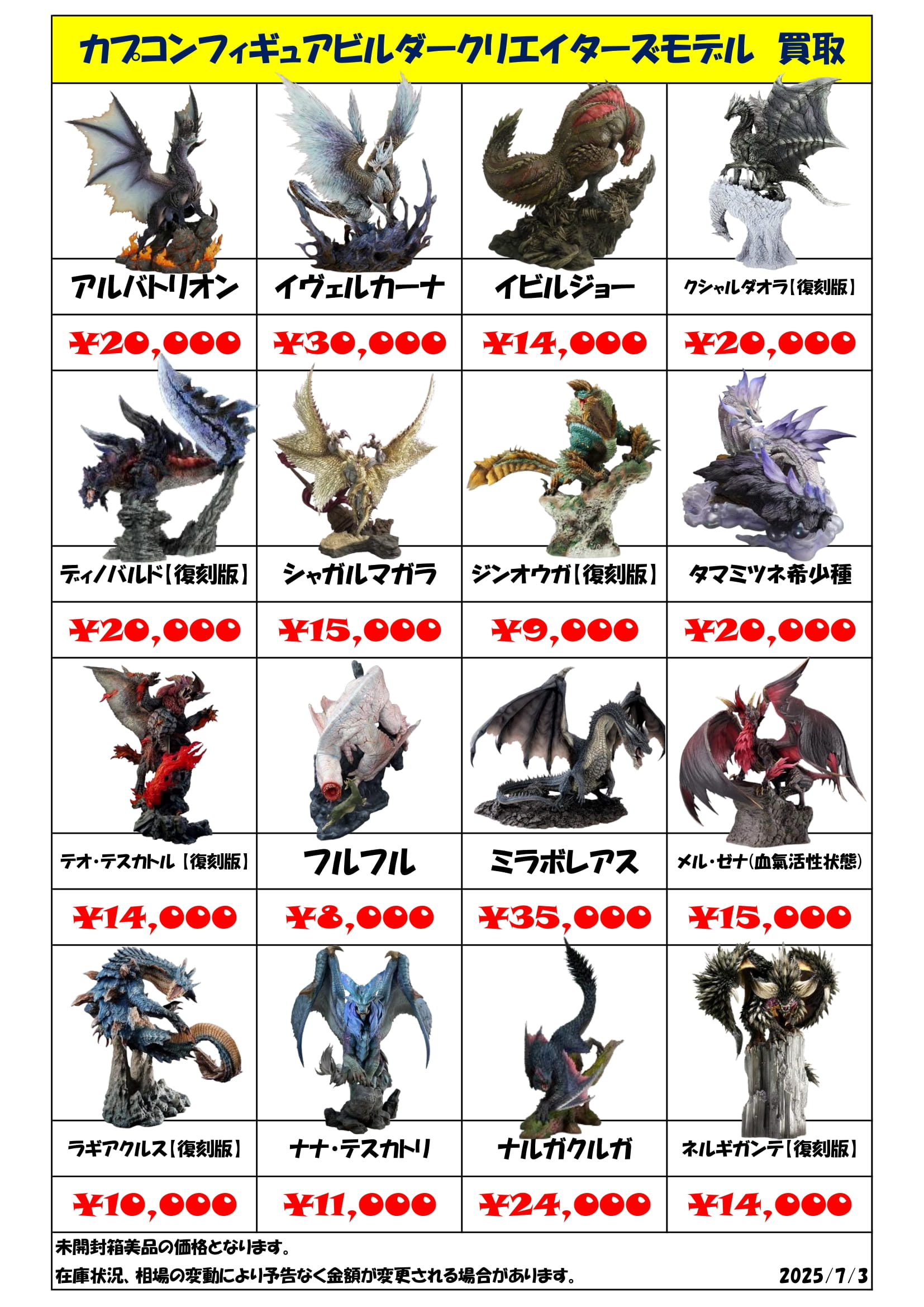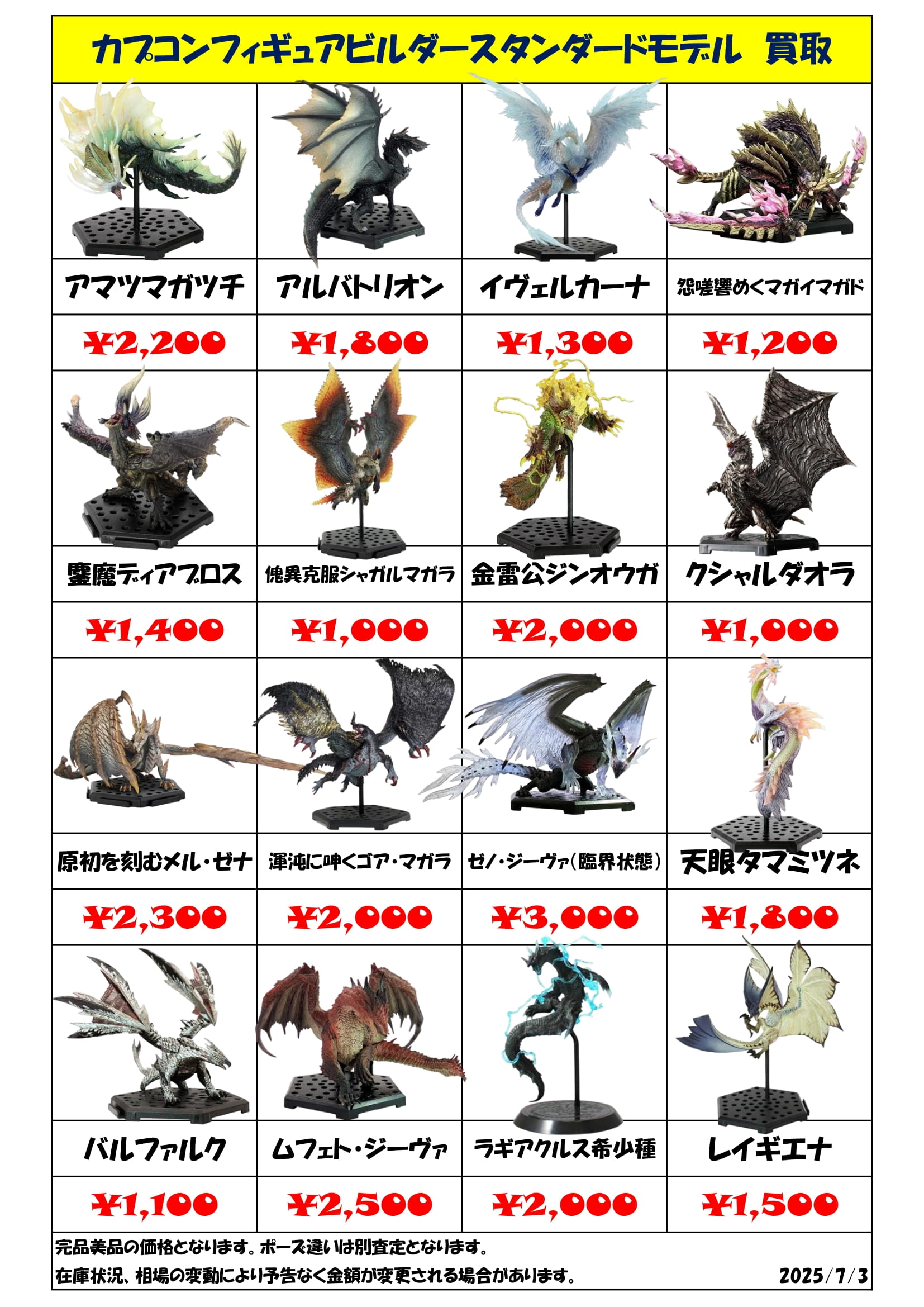 2025.07.04 買取情報 takalab_1 クリエイターズモデルスタンダードモデル 買取チラシ更新しました カプコンフィギュアビルダーのチラシ更新を行いました。 載っていないものも買取いたしますので是非お持ちください! ※2025/7/4 現在の価格となります。 在庫状況・状態によってお値段が変動いたします。予めご了承ください。 **************** こちら↓もぜひチェックしてみてくださいね♪(*´▽`*) ・最新のイベント情報はこちら ・最新の買取情報はこちら コメントを残す コメントをキャンセルメールアドレスが公開されることはありません。 ※ が付いている欄は必須項目ですコメント ※ 名前 ※ メール ※ サイト 新しいコメントをメールで通知 新しい投稿をメールで受け取る Δ