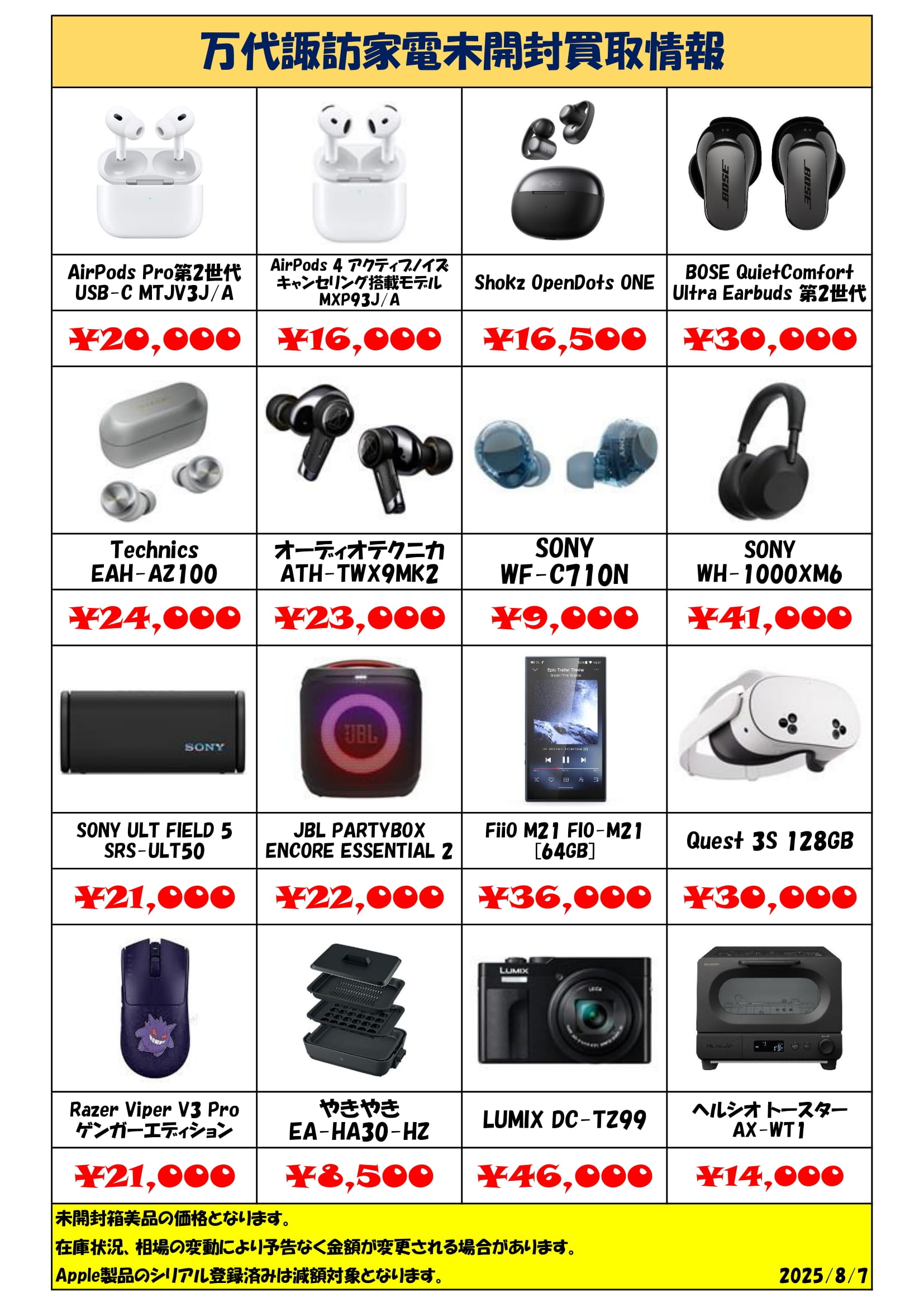2025.08.08 買取情報 takalab_2 ★8月家電チラシ更新★ 今月の家電買取チラシを更新しました! 不要になった品物がございましたら、是非お持ちください! ※2025/8/8現在の価格となります。 在庫状況・状態によってお値段が変動いたします。予めご了承ください。 **************** こちら↓もぜひチェックしてみてくださいね♪(*´▽`*) ・最新のイベント情報はこちら ・最新の買取情報はこちら コメントを残す コメントをキャンセルメールアドレスが公開されることはありません。 ※ が付いている欄は必須項目ですコメント ※ 名前 ※ メール ※ サイト 新しいコメントをメールで通知 新しい投稿をメールで受け取る Δ
