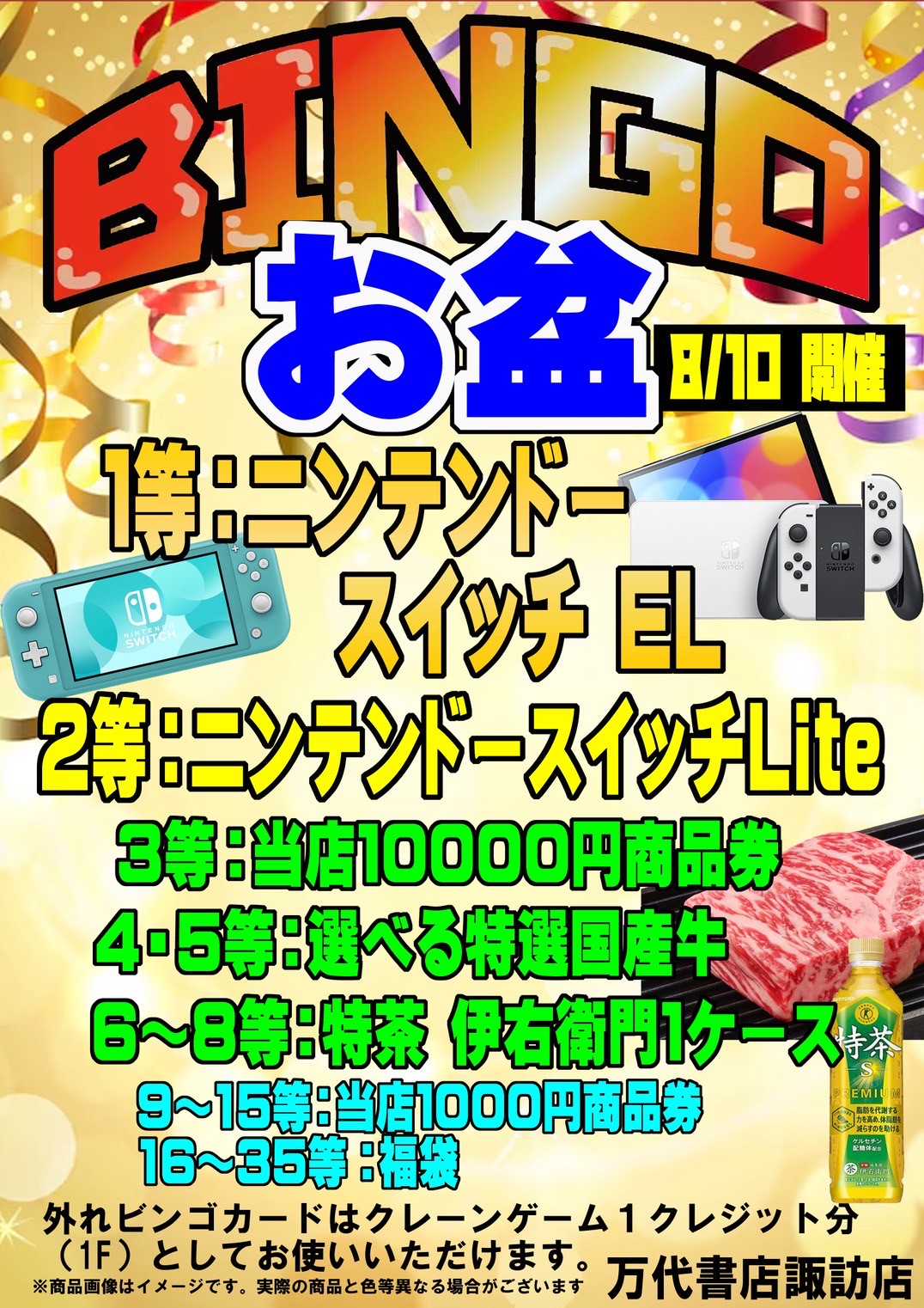 2025.08.10 イベント情報! takalab_1 ☆お盆のイベントのお知らせ☆ 万代書店諏訪店ではお盆期間中イベント等を開催しております!是非よければ遊びに来て下さい! **************** こちら↓もぜひチェックしてみてくださいね♪(*´▽`*) ・最新のイベント情報はこちら ・最新の買取情報はこちら コメントを残す コメントをキャンセルメールアドレスが公開されることはありません。 ※ が付いている欄は必須項目ですコメント ※ 名前 ※ メール ※ サイト 新しいコメントをメールで通知 新しい投稿をメールで受け取る Δ