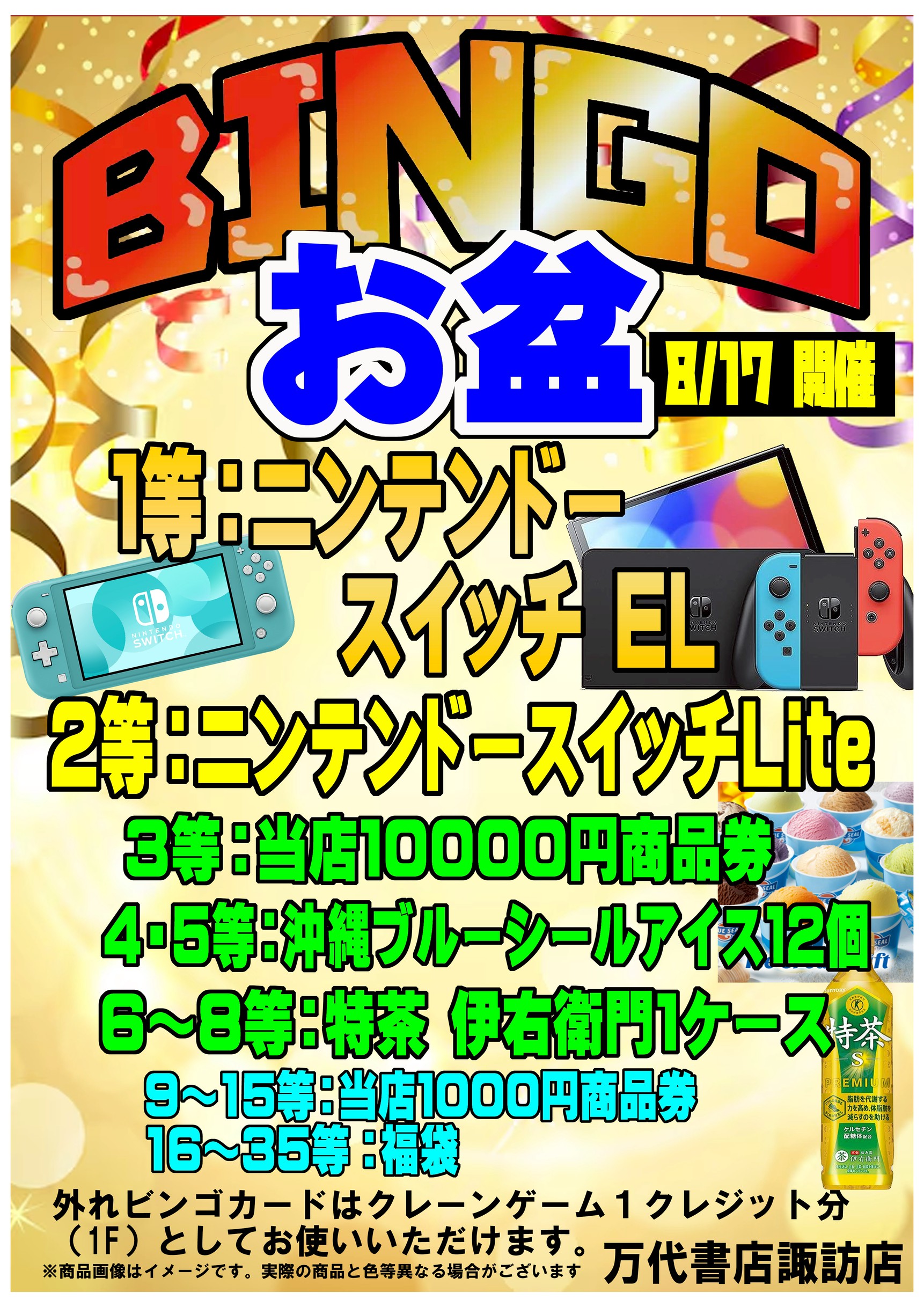 2025.08.17 イベント情報! takalab_4 ☆★お盆のイベントのお知らせ★☆ 8月17日はビンゴ大会を予定しております! お盆休み最終日ですが、よろしければご参加ください!! 景品につきましては画像にてご確認ください! ご参加お待ちしてまーす! **************** こちら↓もぜひチェックしてみてくださいね♪(*´▽`*) ・最新のイベント情報はこちら ・最新の買取情報はこちら コメントを残す コメントをキャンセルメールアドレスが公開されることはありません。 ※ が付いている欄は必須項目ですコメント ※ 名前 ※ メール ※ サイト 新しいコメントをメールで通知 新しい投稿をメールで受け取る Δ