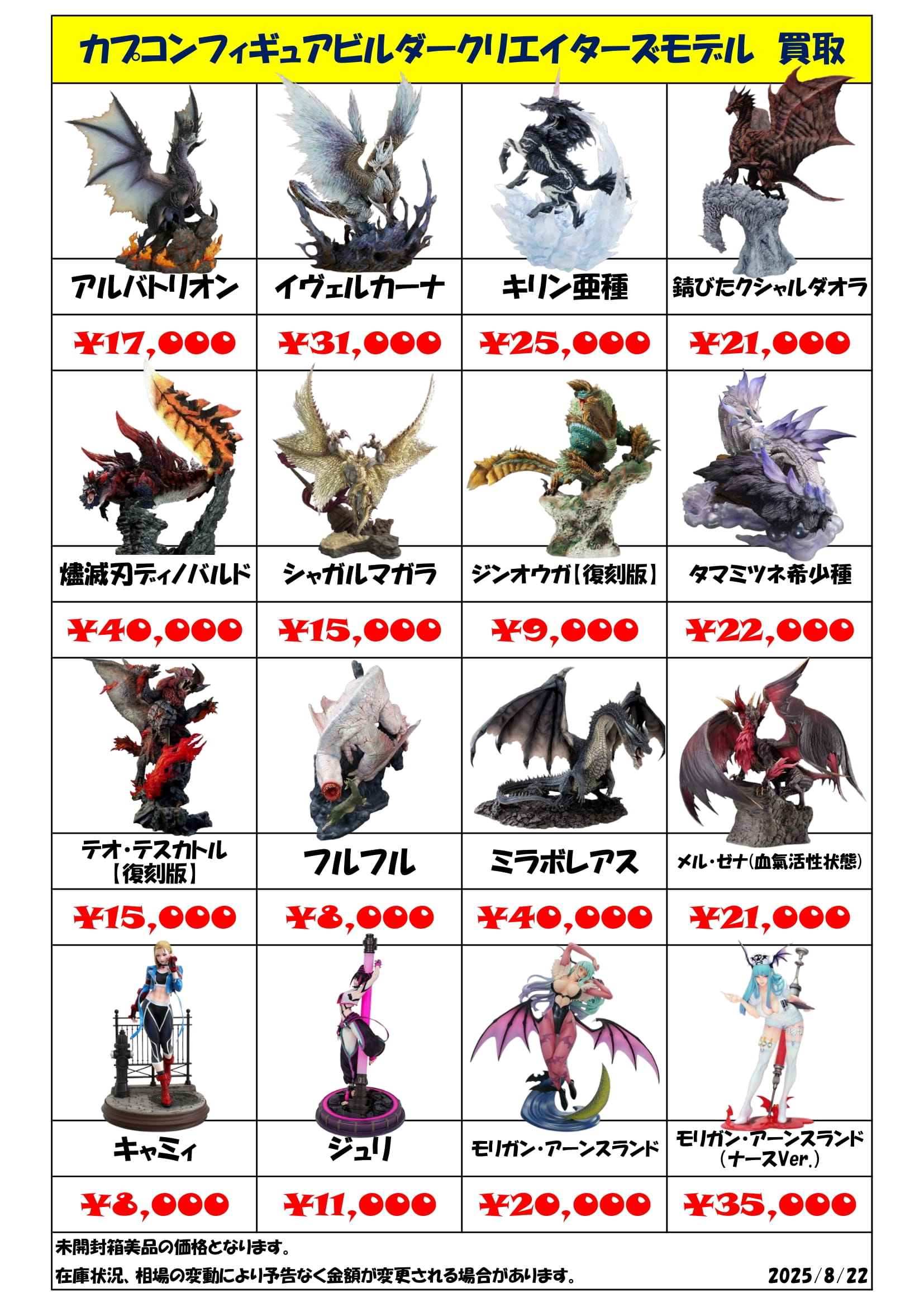 2025.08.23 買取情報 takalab_4 ☆★《カプコンフィギュアビルダークリエイターズモデル》買取チラシ更新しました★☆ カプコンフィギュアビルダークリエイターズモデルのチラシ更新を行いました。 モンハンに限らず買い取りますので是非お持ちください! ※2025/8/22現在の価格となります。 在庫状況・状態によってお値段が変動いたします。予めご了承ください。 **************** こちら↓もぜひチェックしてみてくださいね♪(*´▽`*) ・最新のイベント情報はこちら ・最新の買取情報はこちら コメントを残す コメントをキャンセルメールアドレスが公開されることはありません。 ※ が付いている欄は必須項目ですコメント ※ 名前 ※ メール ※ サイト 新しいコメントをメールで通知 新しい投稿をメールで受け取る Δ