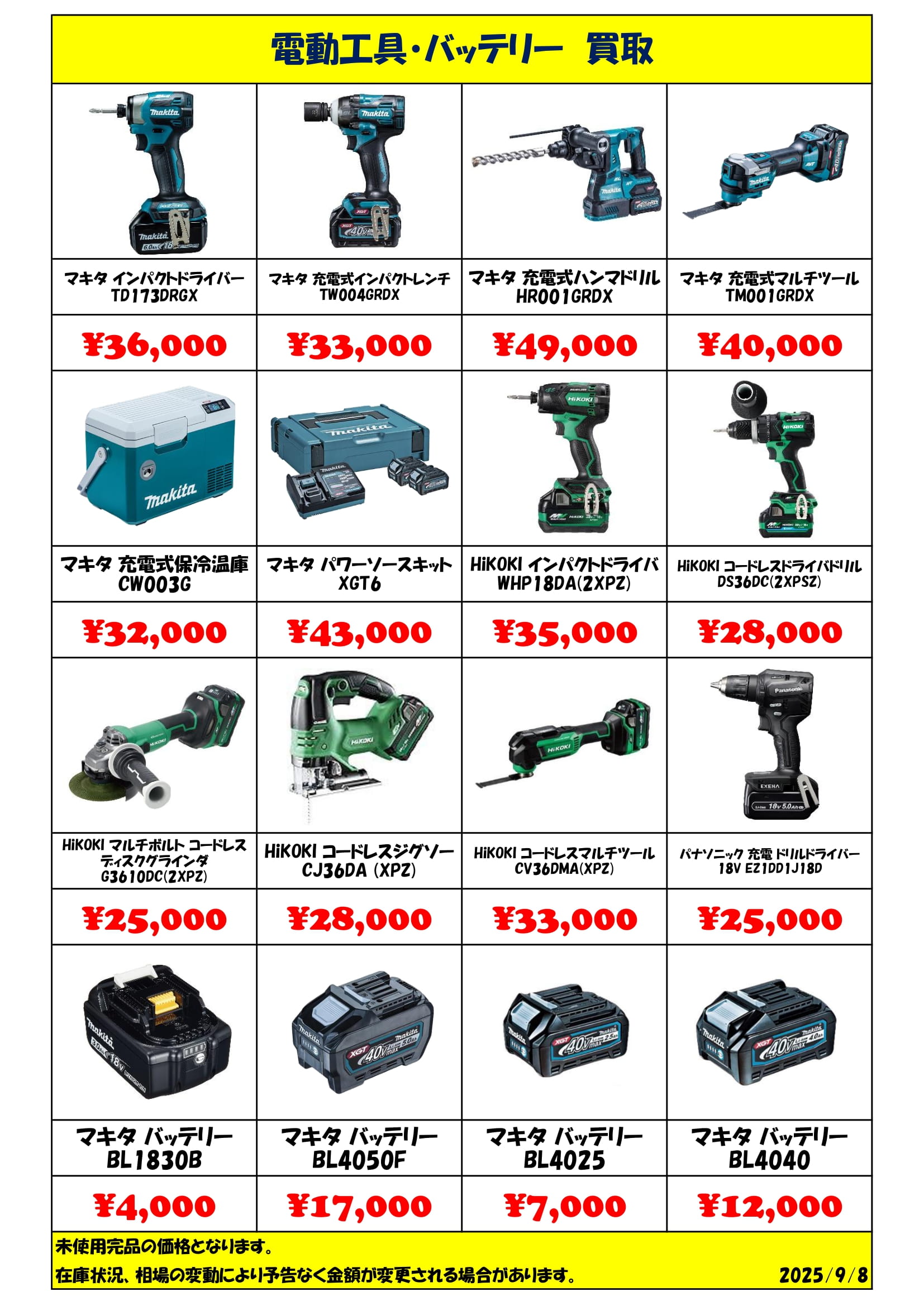 2025.09.09 買取情報 takalab_4 ☆★電動工具まだまだ買取いたします!★☆ 電動工具がまだまだ不足しています。 未使用・中古問わず買取いたしますので、是非お持ちください! ※2025/9/9現在の価格となります。 在庫状況・状態によってお値段が変動いたします。予めご了承ください。 **************** こちら↓もぜひチェックしてみてくださいね♪(*´▽`*) ・最新のイベント情報はこちら ・最新の買取情報はこちら コメントを残す コメントをキャンセルメールアドレスが公開されることはありません。 ※ が付いている欄は必須項目ですコメント ※ 名前 ※ メール ※ サイト 新しいコメントをメールで通知 新しい投稿をメールで受け取る Δ