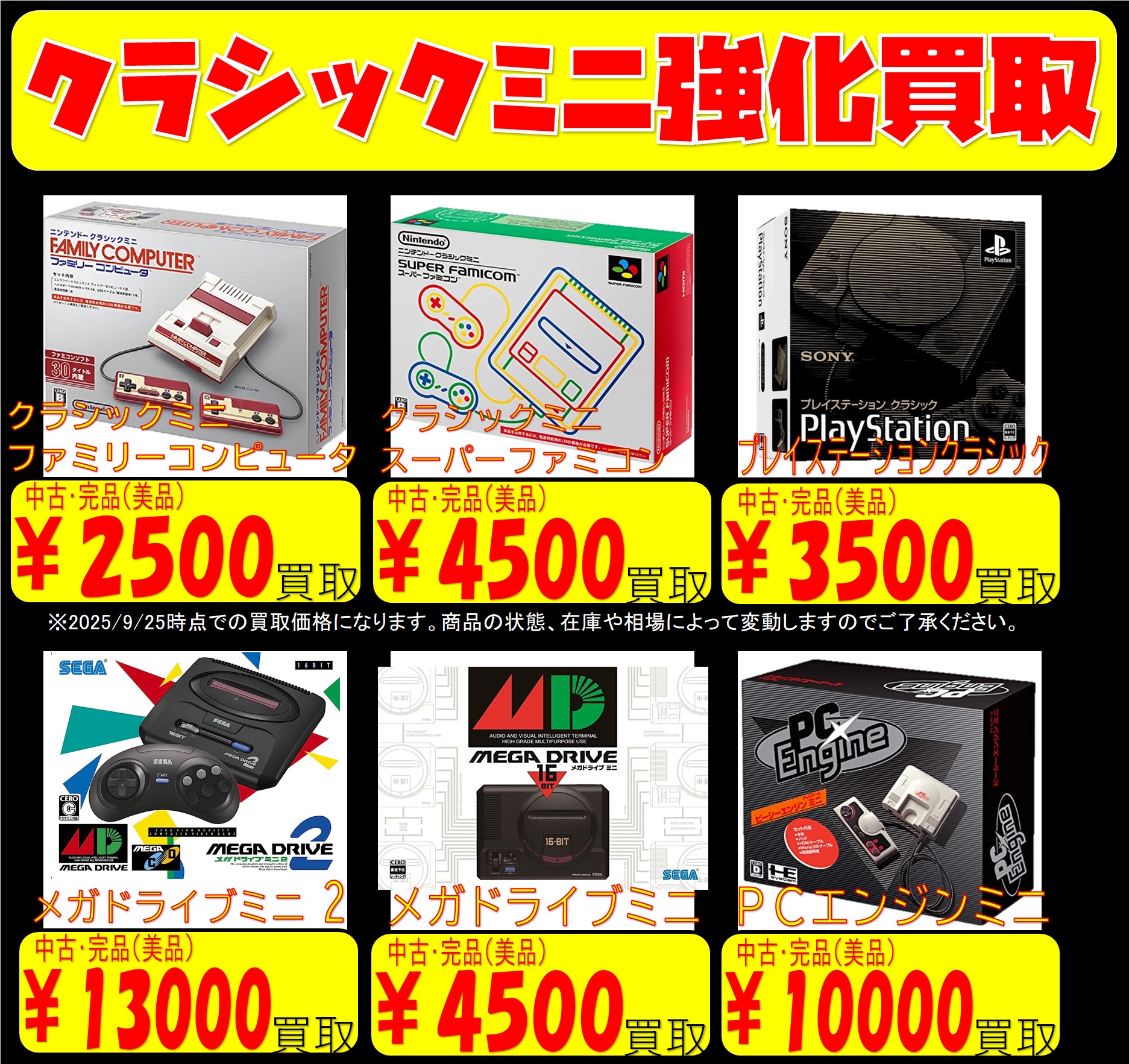 2025.09.26 買取情報 takalab_6 クラシックミニ系買取強化! ゲームコーナーよりお知らせ クラシックミニ系本体を買取強化中!! 収録ソフトをやりきって置物になっているその本体、 是非一度買取にお持ち下さい(‘ω’)ノ ※買取価格は2025/9/25時点での価格になります。商品の状態、在庫や相場により 予告無く変動致しますので、ご了承ください。 **************** こちら↓もぜひチェックしてみてくださいね♪(*´▽`*) ・最新のイベント情報はこちら ・最新の買取情報はこちら コメントを残す コメントをキャンセルメールアドレスが公開されることはありません。 ※ が付いている欄は必須項目ですコメント ※ 名前 ※ メール ※ サイト 新しいコメントをメールで通知 新しい投稿をメールで受け取る Δ