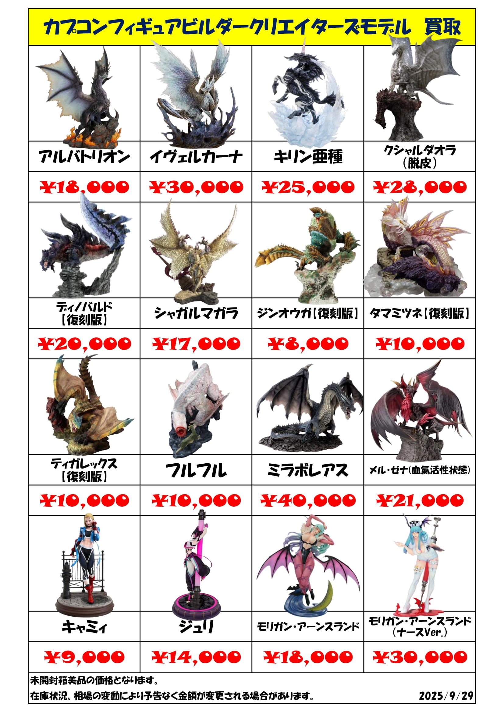 2025.09.30 買取情報 takalab_6 ◆カプコンフィギュアビルダークリエイターズモデル 買取チラシ更新しました◆ カプコンフィギュアビルダークリエイターズモデルのチラシ更新を行いました。 載っていないものや、スタンダードモデルも買取いたしますので是非お持ちください! ※2025/9/30現在の価格となります。 在庫状況・状態によってお値段が変動いたします。予めご了承ください。 **************** こちら↓もぜひチェックしてみてくださいね♪(*´▽`*) ・最新のイベント情報はこちら ・最新の買取情報はこちら コメントを残す コメントをキャンセルメールアドレスが公開されることはありません。 ※ が付いている欄は必須項目ですコメント ※ 名前 ※ メール ※ サイト 新しいコメントをメールで通知 新しい投稿をメールで受け取る Δ