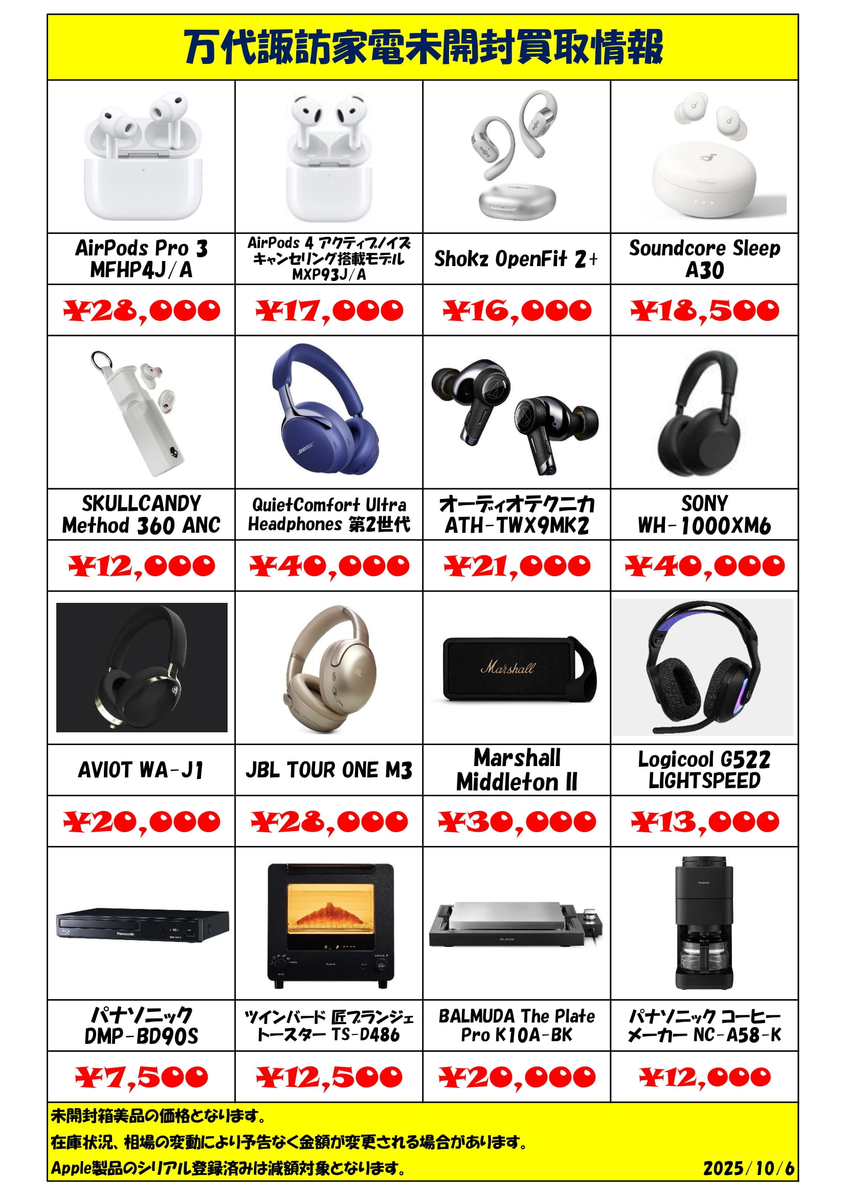 2025.10.07 買取情報 takalab_2 ★10月家電チラシ更新★ 今月の家電買取チラシを更新しました! Air pods Pro3の金額も掲載いたしました! 生活家電の買取も行っておりますので、是非お持ちください! ※2025/10/7現在の価格となります。 在庫状況・状態によってお値段が変動いたします。予めご了承ください。 **************** こちら↓もぜひチェックしてみてくださいね♪(*´▽`*) ・最新のイベント情報はこちら ・最新の買取情報はこちら コメントを残す コメントをキャンセルメールアドレスが公開されることはありません。 ※ が付いている欄は必須項目ですコメント ※ 名前 ※ メール ※ サイト 新しいコメントをメールで通知 新しい投稿をメールで受け取る Δ