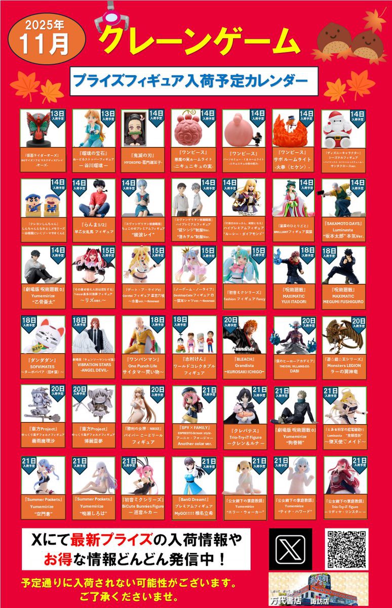 2025.11.02 アミューズ takalab_1 ⭐️2025年11月プライズフィギュア入荷予定カレンダー⭐️ お待たせしました‼11月の入荷予定カレンダーです‼ 今月の注目はGrandistaから登場のエレン、リヴァイ兵長、黒崎一護 とGLITTER&GLAMOURSから登場の キュアブラック、キュアホワイト です‼ 他にも気になるフィギュアいろいろ‼ 是非ゲットしてくださいね‼ コメントを残す コメントをキャンセルメールアドレスが公開されることはありません。 ※ が付いている欄は必須項目ですコメント ※ 名前 ※ メール ※ サイト 新しいコメントをメールで通知 新しい投稿をメールで受け取る Δ