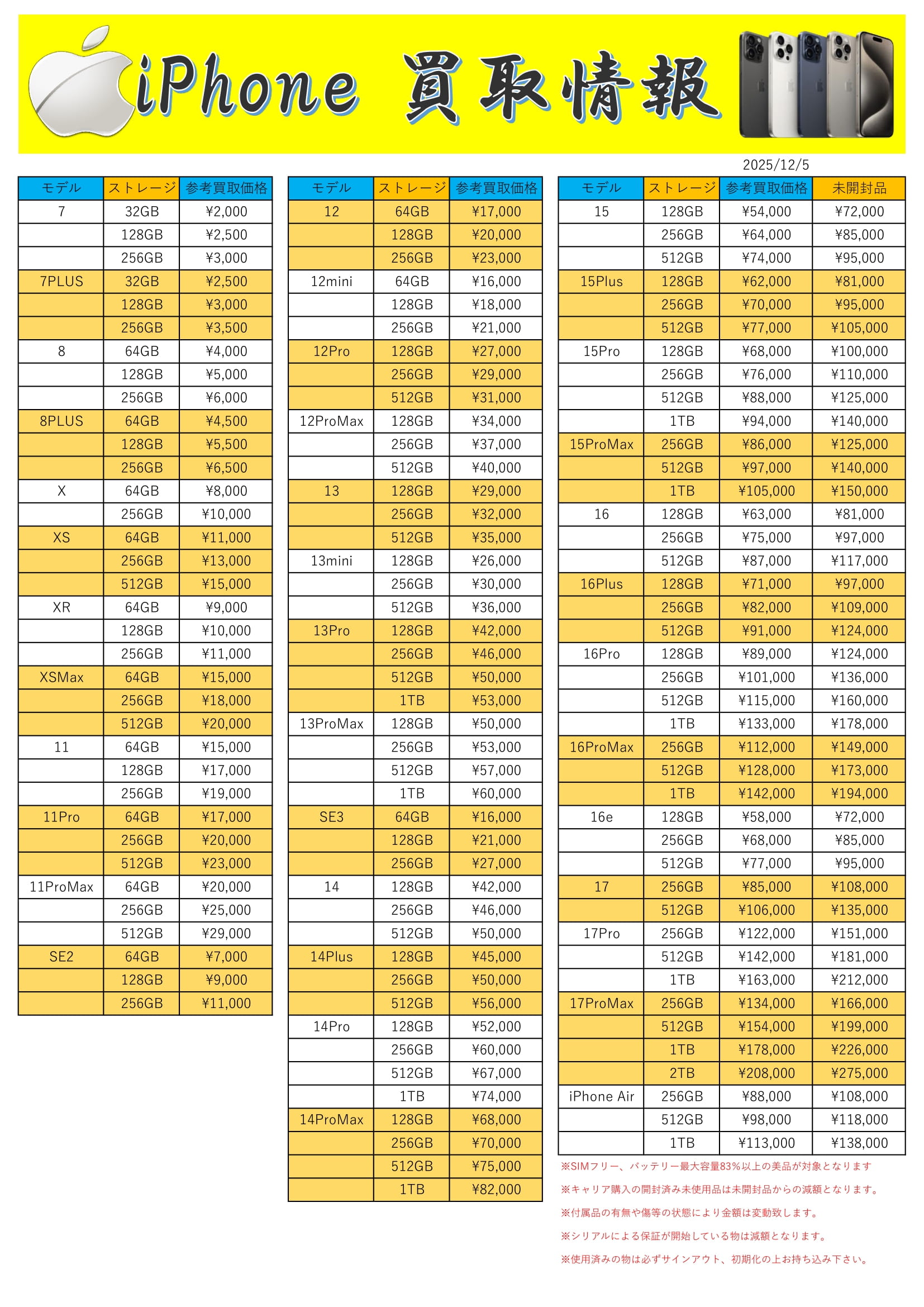 2025.12.06 買取情報 takalab_2 ★iPhoneリスト更新★ ★iPhoneリスト更新★ 間が空いてしまいましたがiPhoneの買取リストを更新いたしました。 使わなくなったApple製品気軽にお持ちください! ※2025/12/6現在の価格となります。 在庫状況・状態によってお値段が変動いたします。予めご了承ください。 **************** こちら↓もぜひチェックしてみてくださいね♪(*´▽`*) ・最新のイベント情報はこちら ・最新の買取情報はこちら コメントを残す コメントをキャンセルメールアドレスが公開されることはありません。 ※ が付いている欄は必須項目ですコメント ※ 名前 ※ メール ※ サイト 新しいコメントをメールで通知 新しい投稿をメールで受け取る Δ
