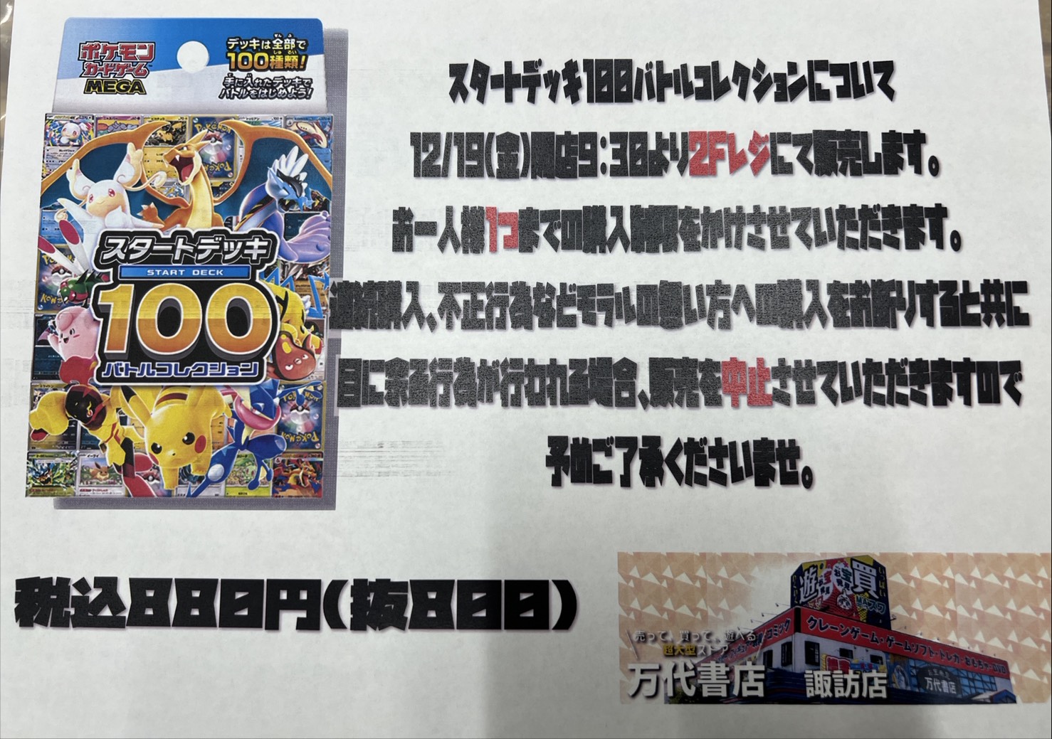 2025.12.18 カード takalab_1 【ポケカ】スタートデッキ100に関するお知らせ 明日12/19販売予定のスタートデッキ100バトルコレクションについてご一読下さい。 販売開始は開店9:30からとなりますので深夜からの販売ではございません。予めご了承下さい。 コメントを残す コメントをキャンセルメールアドレスが公開されることはありません。 ※ が付いている欄は必須項目ですコメント ※ 名前 ※ メール ※ サイト 新しいコメントをメールで通知 新しい投稿をメールで受け取る Δ