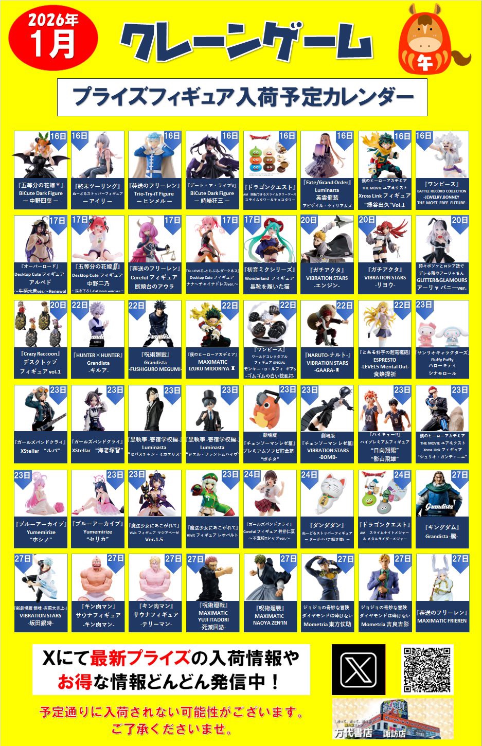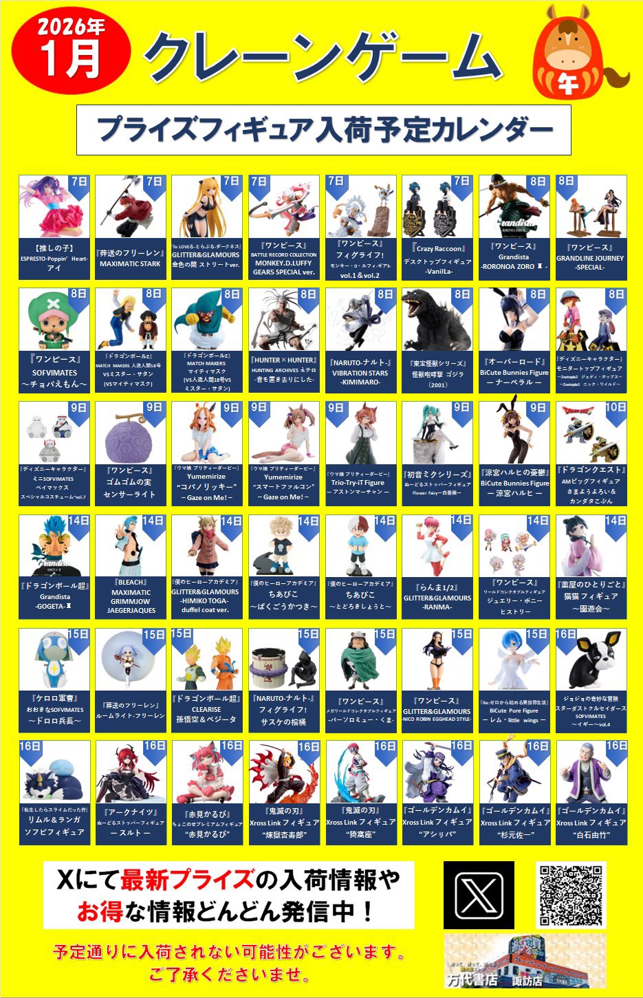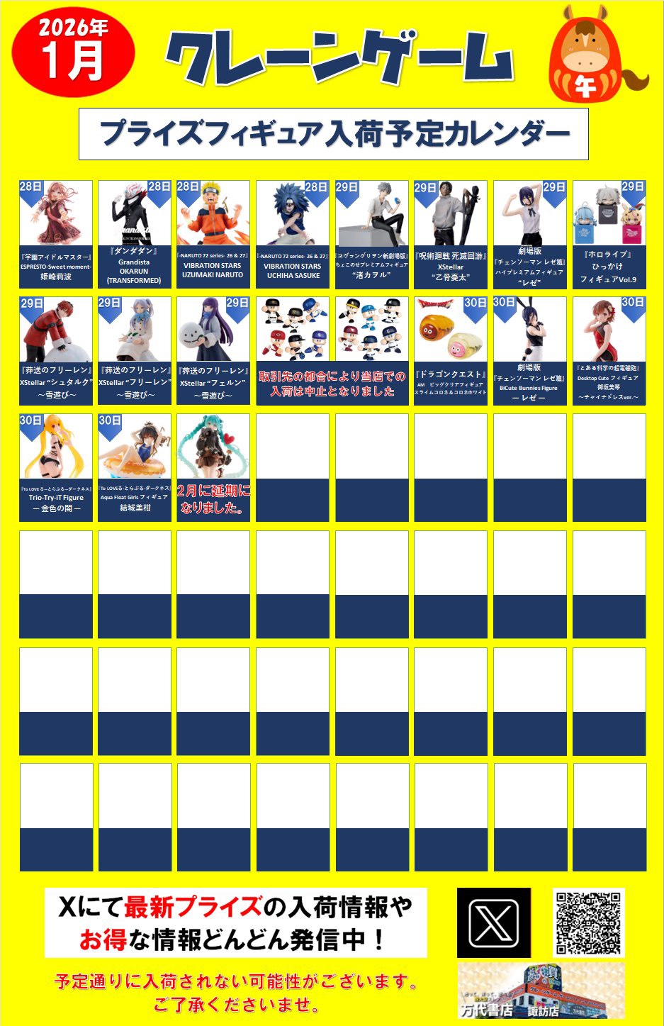 2026.01.06 アミューズ takalab_1 ⭐️2026年1月プライズフィギュア入荷予定カレンダー⭐️ 【2026年1月入荷予定カレンダー】 あけましておめでとうございます‼ 大変お待たせしました!1月の入荷予定カレンダーです‼ 今月の注目はBiCute Bunnies Figureの #レゼ とGrandistaの #騰 #キルア #オカルン です‼ 他にも気になるフィギュアいろいろ‼ 是非ゲットしてくださいね‼ コメントを残す コメントをキャンセルメールアドレスが公開されることはありません。 ※ が付いている欄は必須項目ですコメント ※ 名前 ※ メール ※ サイト 新しいコメントをメールで通知 新しい投稿をメールで受け取る Δ