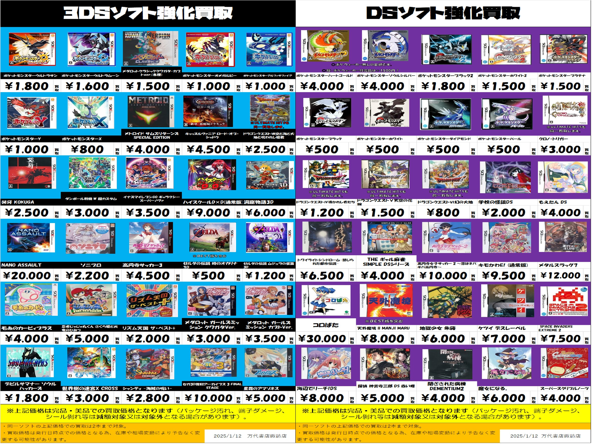 ※上記価格は完品・美品での買取価格となります(パッケージ汚れ、端子ダメージ、シール剝れ等は減額対象又は対象外となる場合があります)