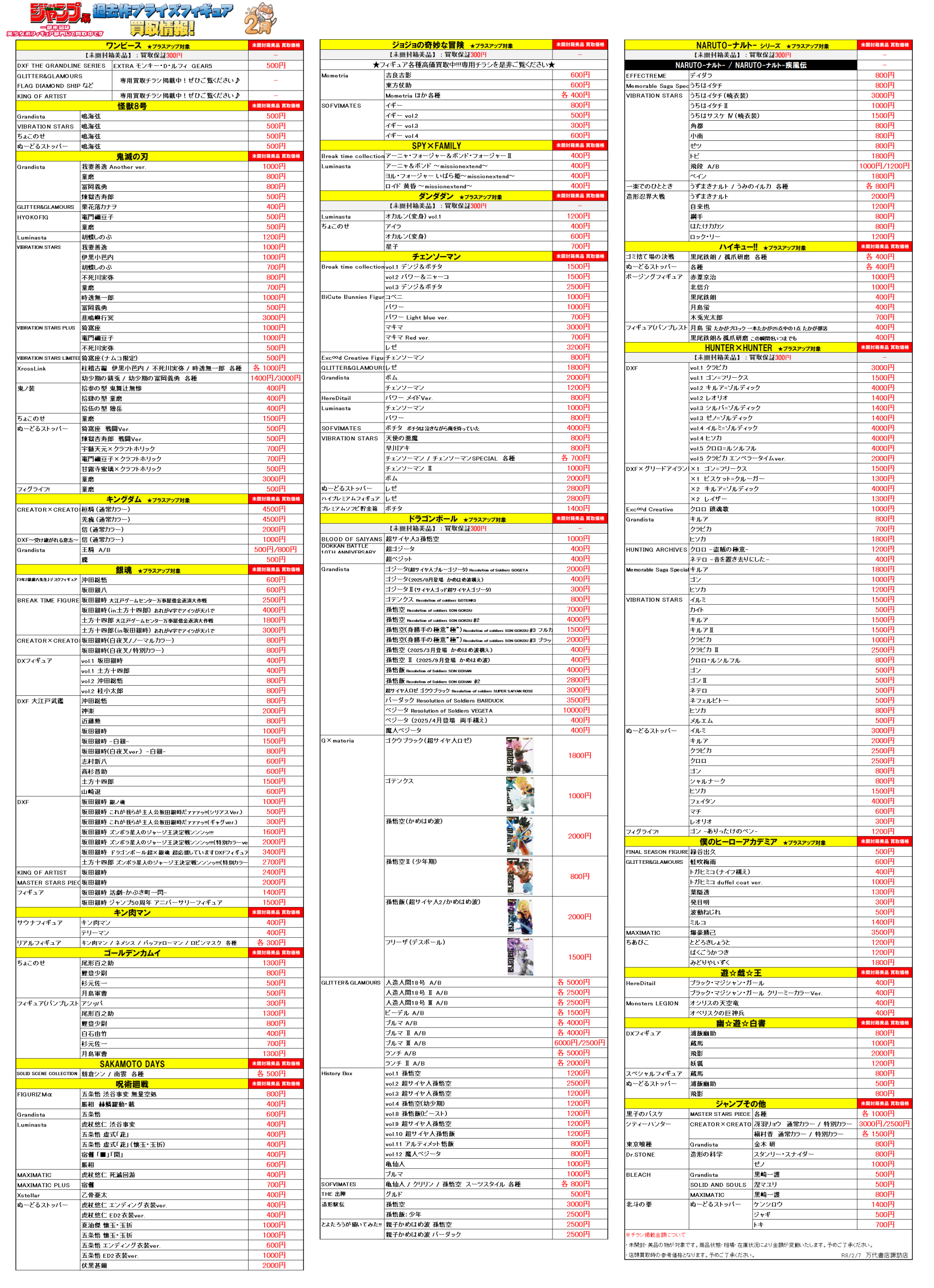 以前に登場したフィギュアの買取参考価格表を作成いたしました(*>v<)ノ