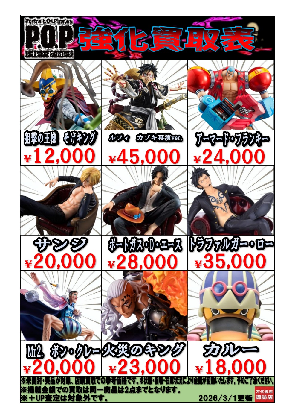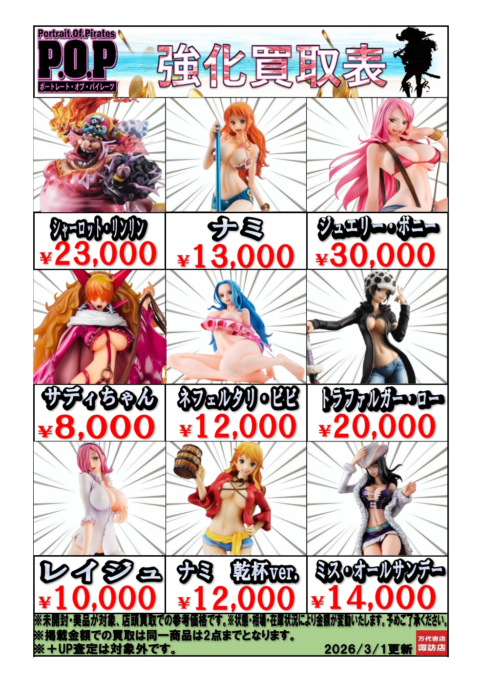 2026.03.01 買取情報 takalab_1 P.O.P 強化買取中 ただいまPOPの買取募集中です!是非当店にお持ちください! 《その他ご依頼内容》3月1日の午前九時半に投稿お願いします ※2026/3/1現在の価格となります。 在庫状況・状態によってお値段が変動いたします。予めご了承ください。 **************** こちら↓もぜひチェックしてみてくださいね♪(*´▽`*) ・最新のイベント情報はこちら ・最新の買取情報はこちら コメントを残す コメントをキャンセルメールアドレスが公開されることはありません。 ※ が付いている欄は必須項目ですコメント ※ 名前 ※ メール ※ サイト 新しいコメントをメールで通知 新しい投稿をメールで受け取る Δ