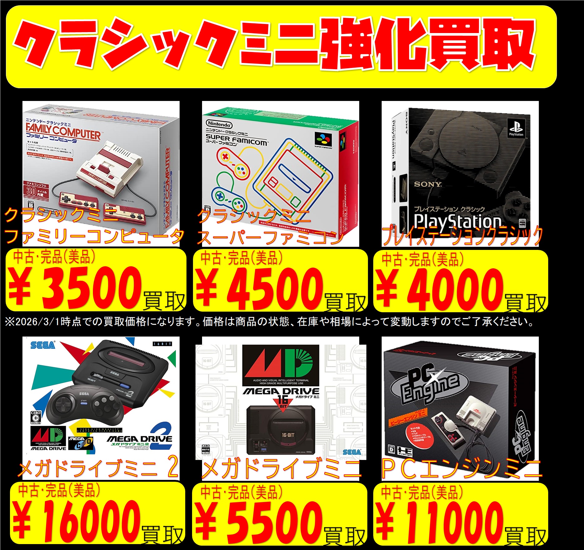2026.03.01 買取情報 takalab_5 ★クラシックミニ系買取強化!★ ★ゲームコーナーよりお知らせ★ クラシックミニ系本体を買取強化中!! 収録ソフトをやりきって置物になっているその本体、 是非一度買取にお持ち下さい(‘ω’)ノ ※買取価格は2026/3/1時点での価格になります。価格は商品の状態、在庫や相場により 予告無く変動致しますので、ご了承ください。 **************** こちら↓もぜひチェックしてみてくださいね♪(*´▽`*) ・最新のイベント情報はこちら ・最新の買取情報はこちら コメントを残す コメントをキャンセルメールアドレスが公開されることはありません。 ※ が付いている欄は必須項目ですコメント ※ 名前 ※ メール ※ サイト 新しいコメントをメールで通知 新しい投稿をメールで受け取る Δ