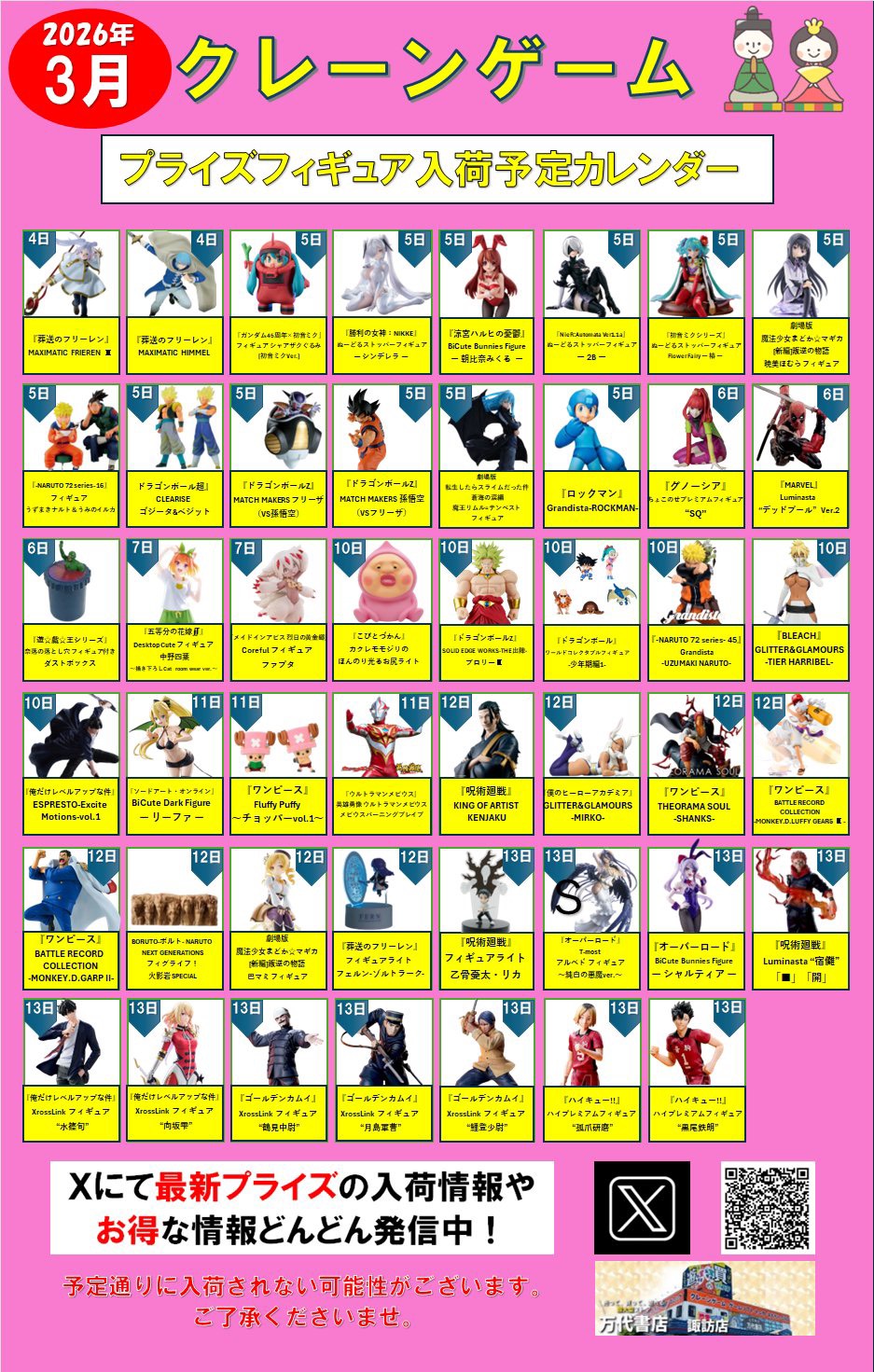 2026.03.08 アミューズ takalab_6 ⭐️2026年3月プライズフィギュア入荷予定カレンダー⭐️ 【2026年3月入荷予定カレンダー】 大変お待たせしました! 3月の入荷予定カレンダーです‼ 今月の注目はGrandistaの ナルト、サスケ、サクラとFIGURIZMαの魔虚羅です‼ 他にも気になるフィギュアいろいろ! 是非ゲットしてくださいね‼ コメントを残す コメントをキャンセルメールアドレスが公開されることはありません。 ※ が付いている欄は必須項目ですコメント ※ 名前 ※ メール ※ サイト 新しいコメントをメールで通知 新しい投稿をメールで受け取る Δ