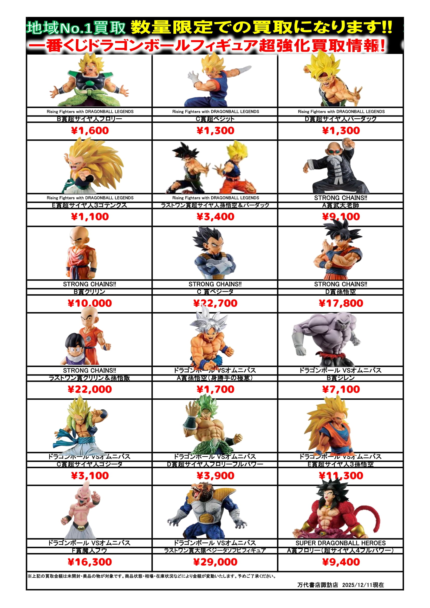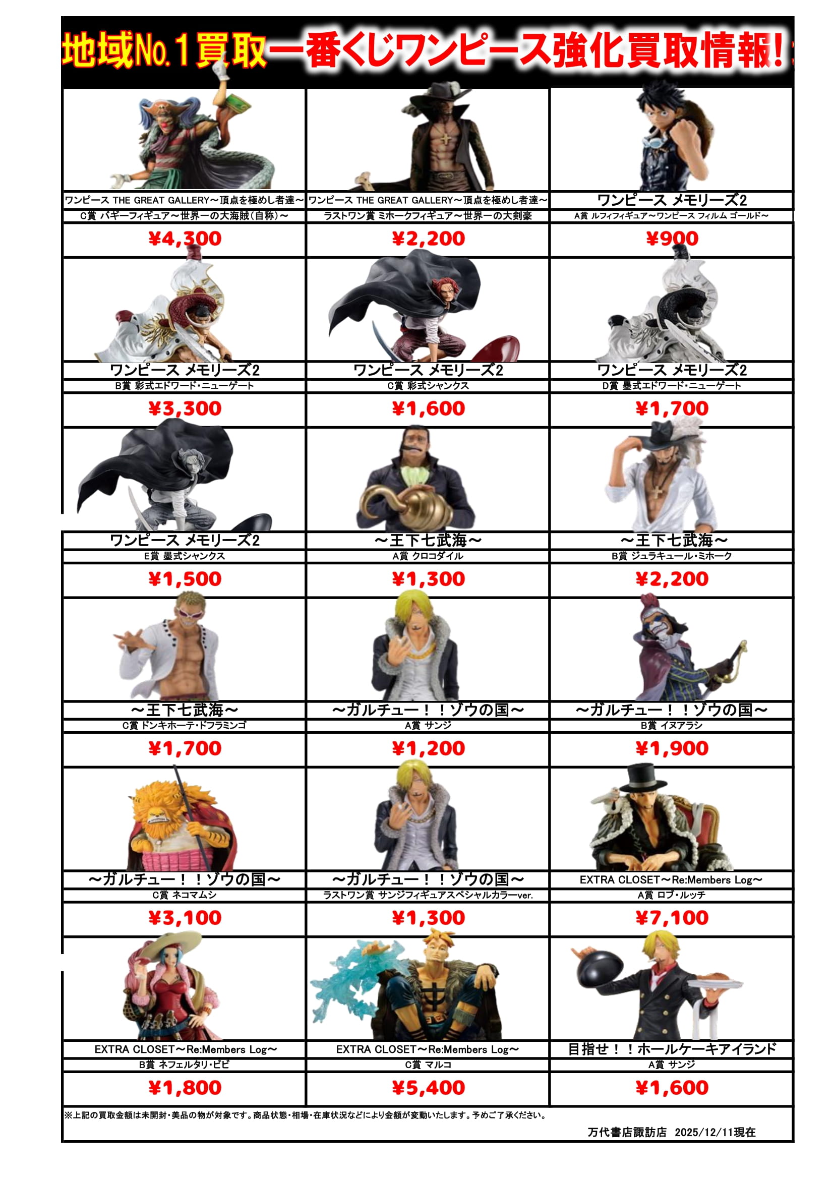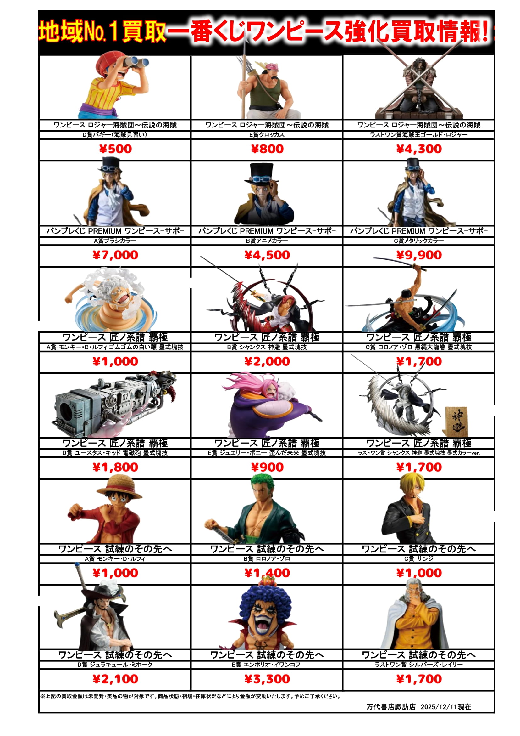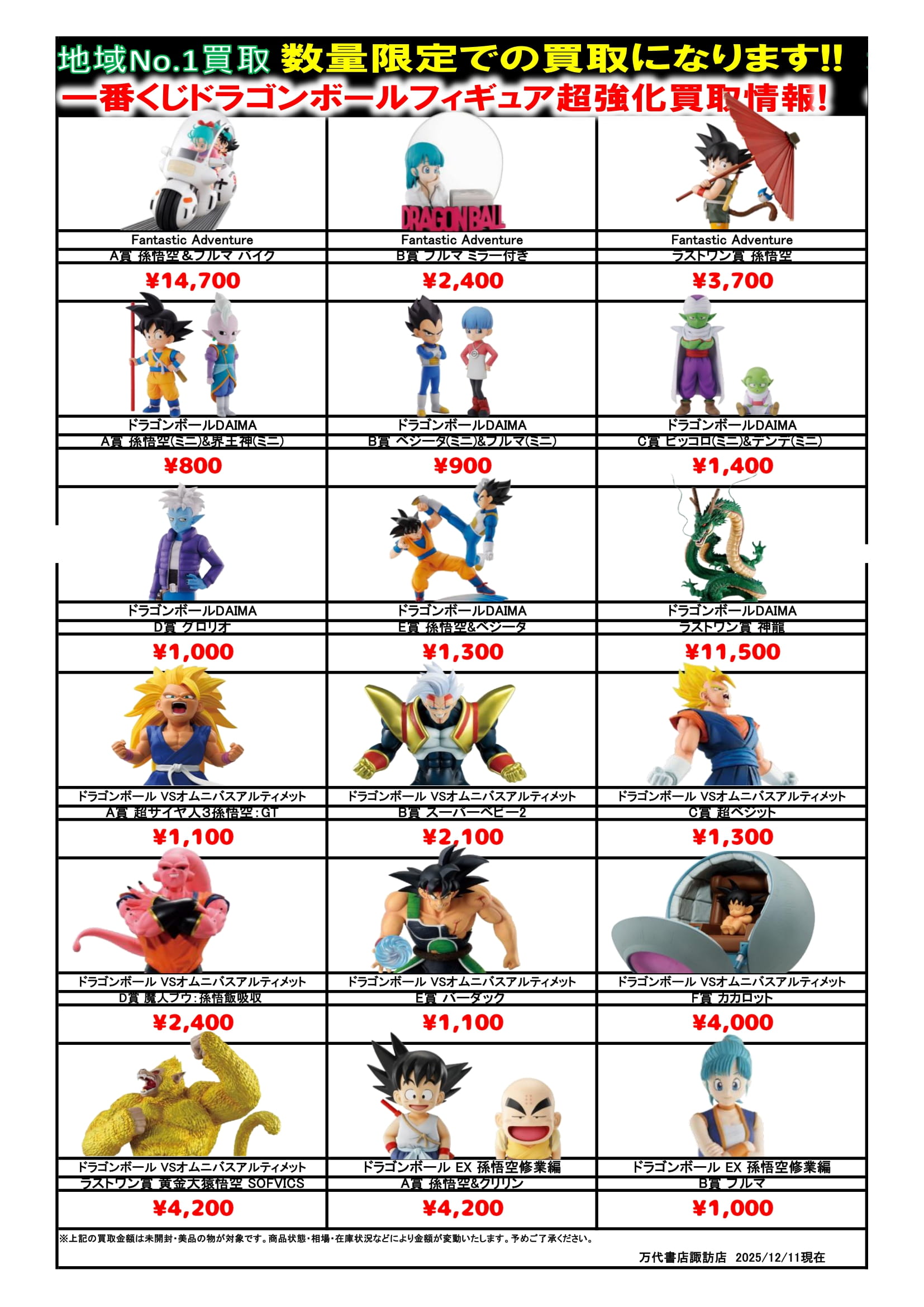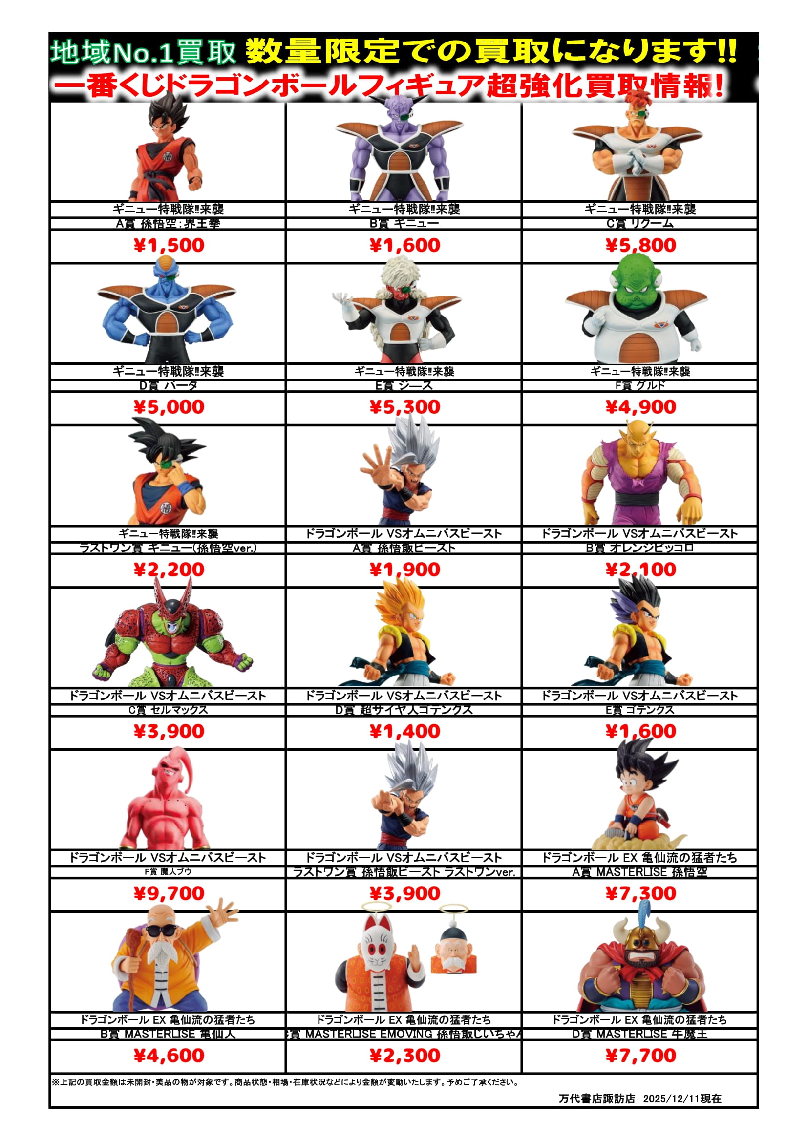 ドラゴンボール・ワンピース フィギュア WEBチラシ 2025/12/23 更新 フィギュアはこちら プライズフィギュアはこちら 美少女フィギュアはこちら チラシの掲載金額は店頭買取時での参考価格となります。 【ワンピース】 【ドラゴンボール】