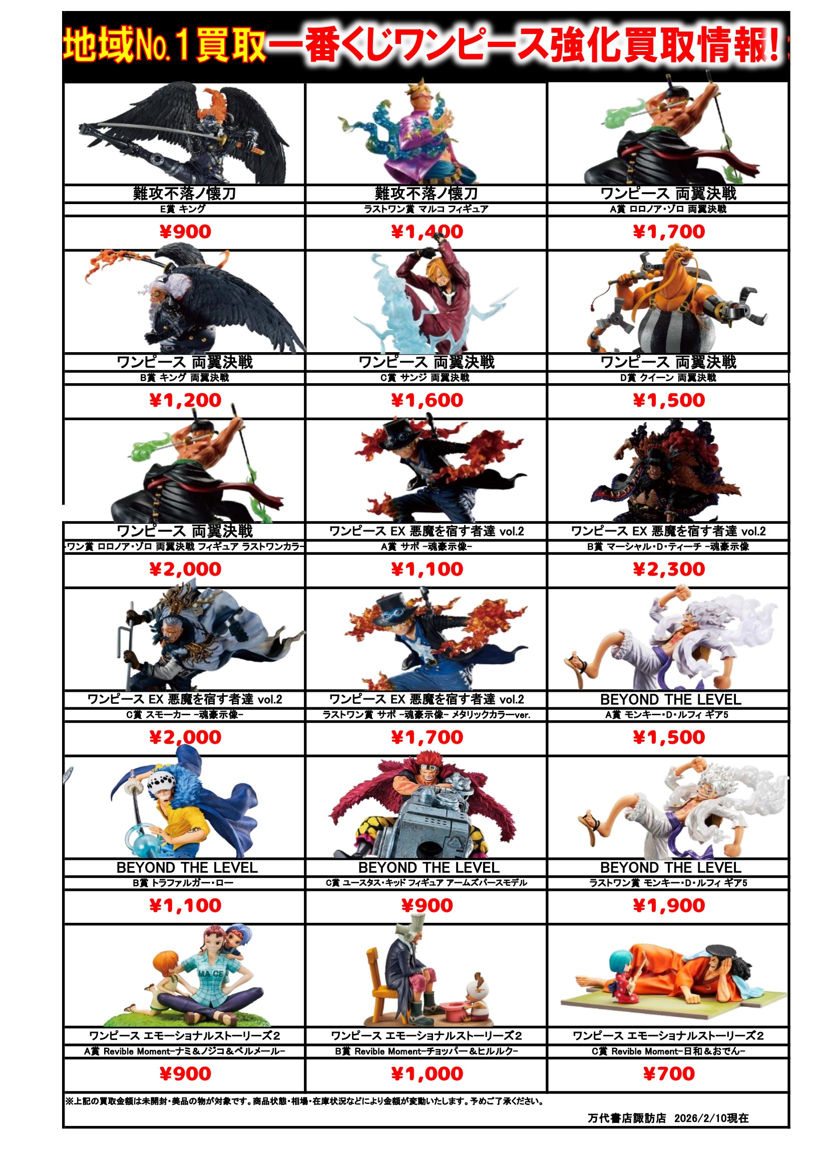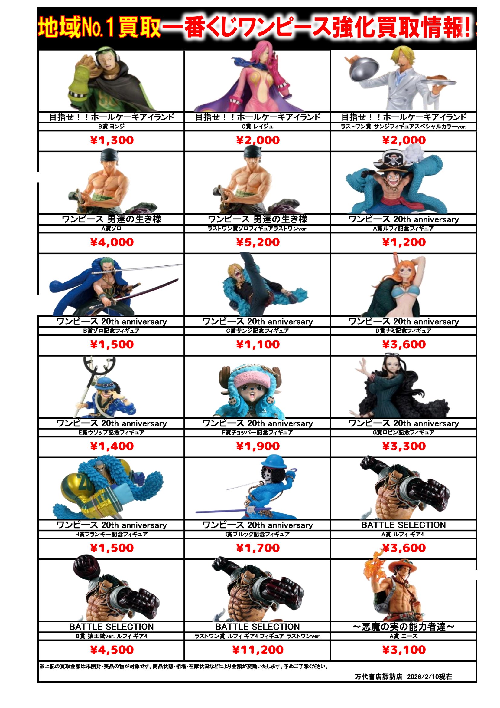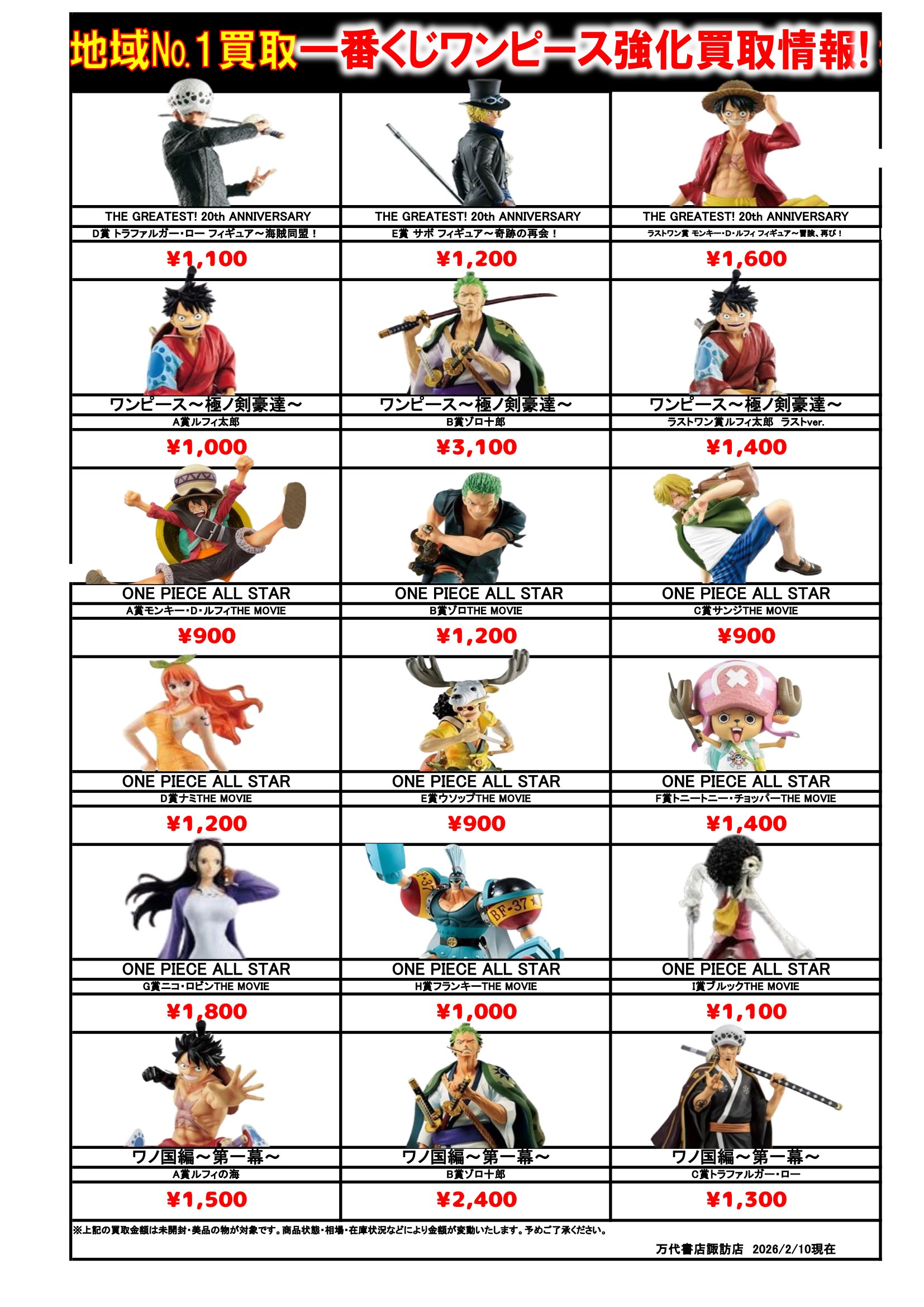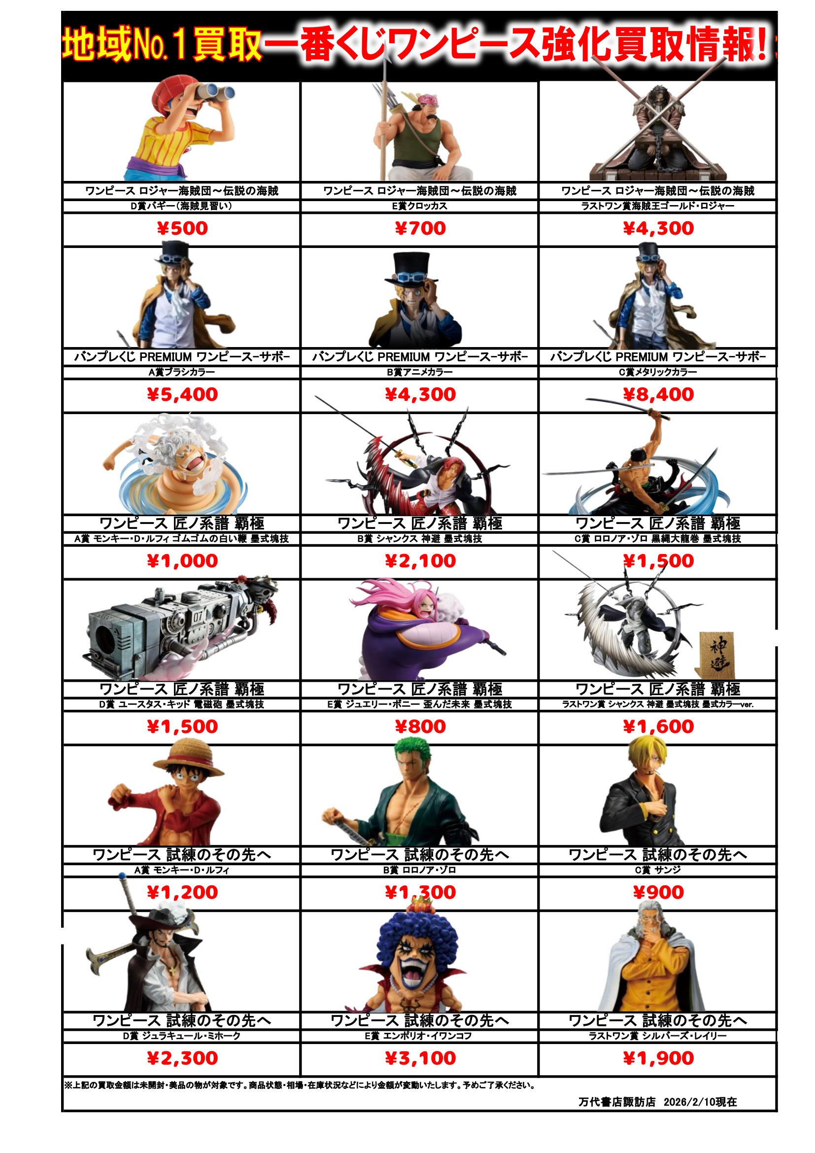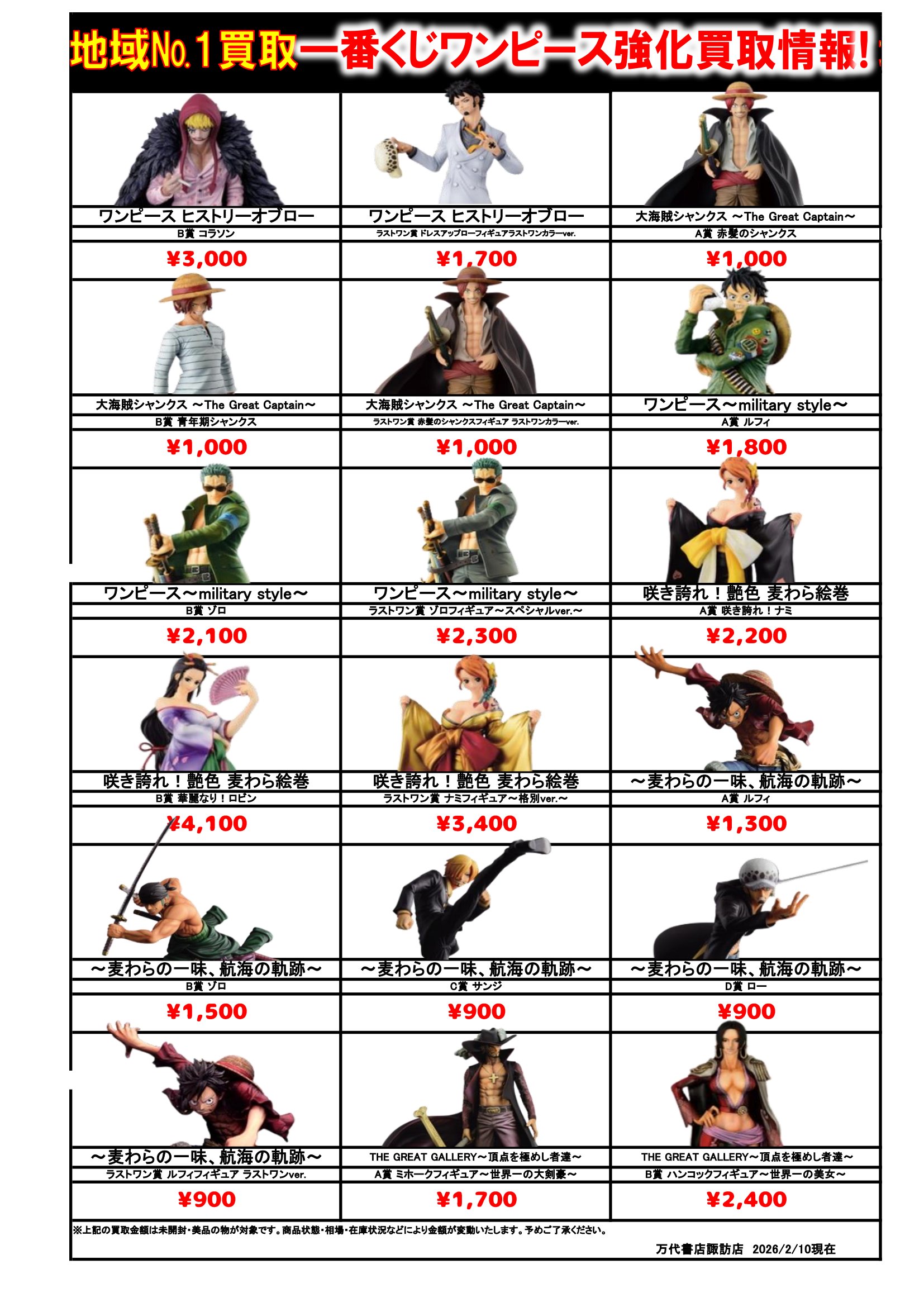 ドラゴンボール・ワンピース フィギュア WEBチラシ 2026/2/10 更新 フィギュアはこちら プライズフィギュアはこちら 美少女フィギュアはこちら チラシの掲載金額は店頭買取時での参考価格となります。 【ワンピース】 【ドラゴンボール】