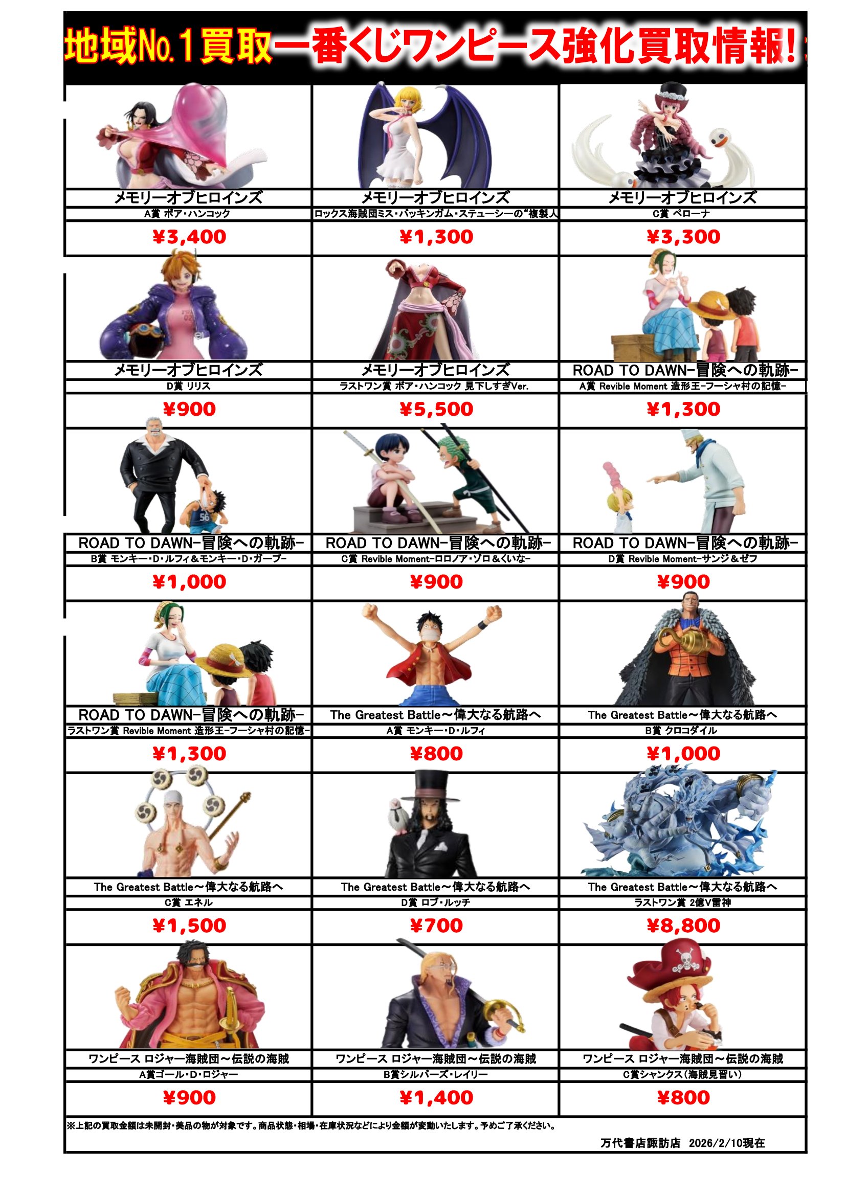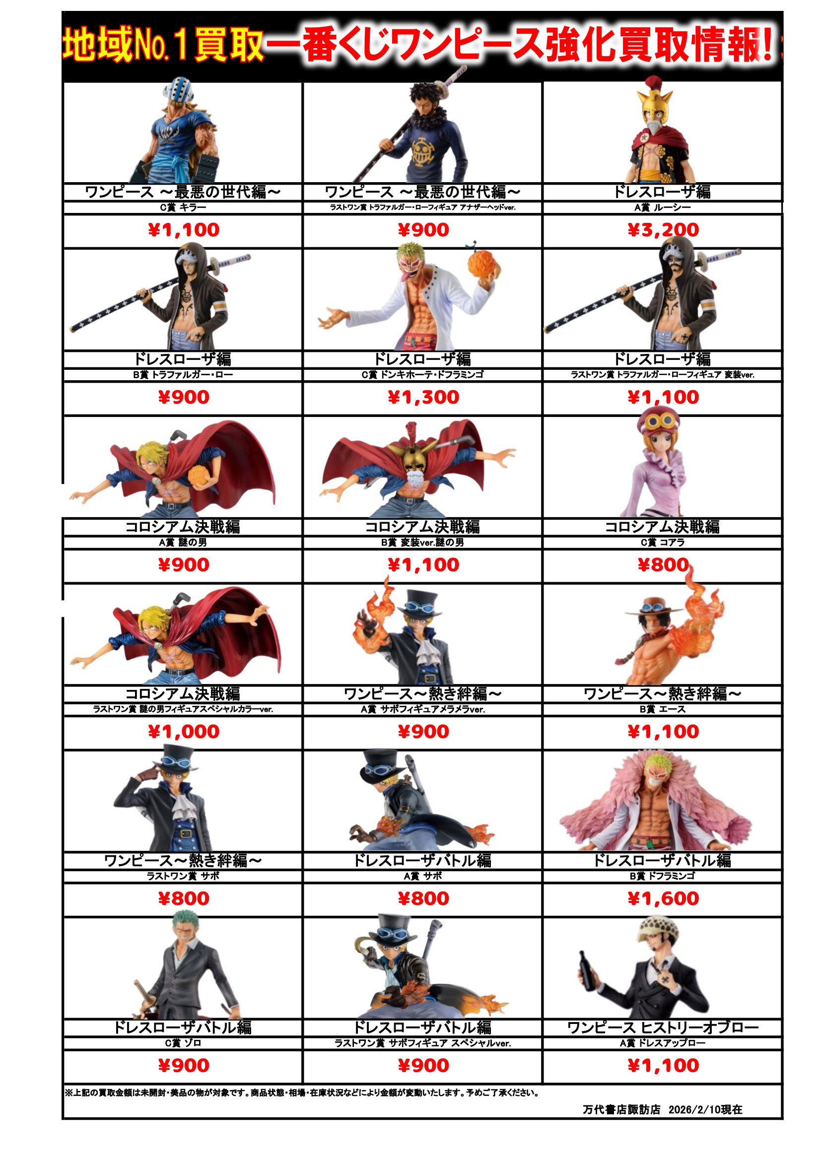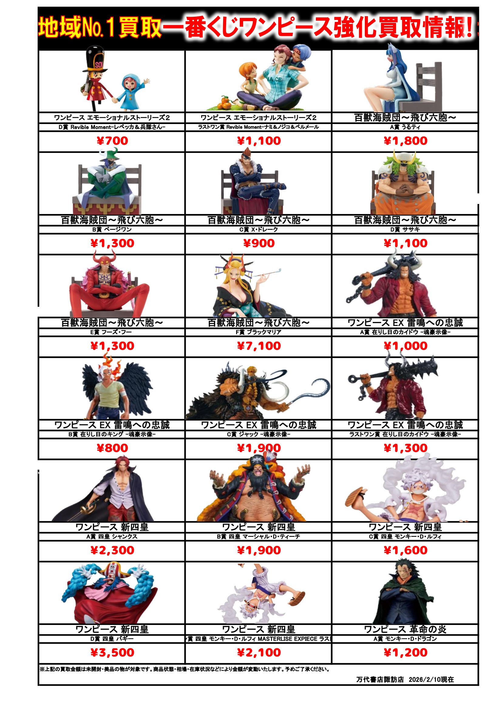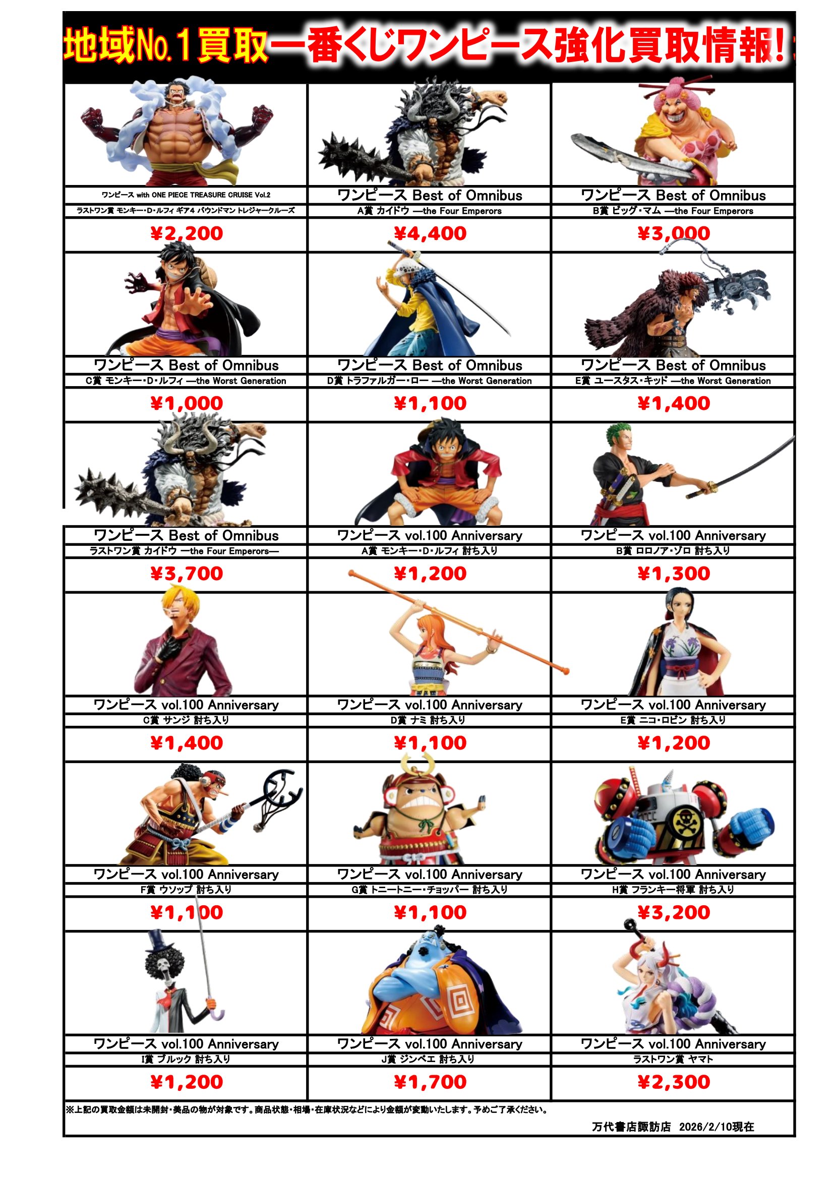 ドラゴンボール・ワンピース フィギュア WEBチラシ 2026/2/10 更新 フィギュアはこちら プライズフィギュアはこちら 美少女フィギュアはこちら チラシの掲載金額は店頭買取時での参考価格となります。 【ワンピース】 【ドラゴンボール】