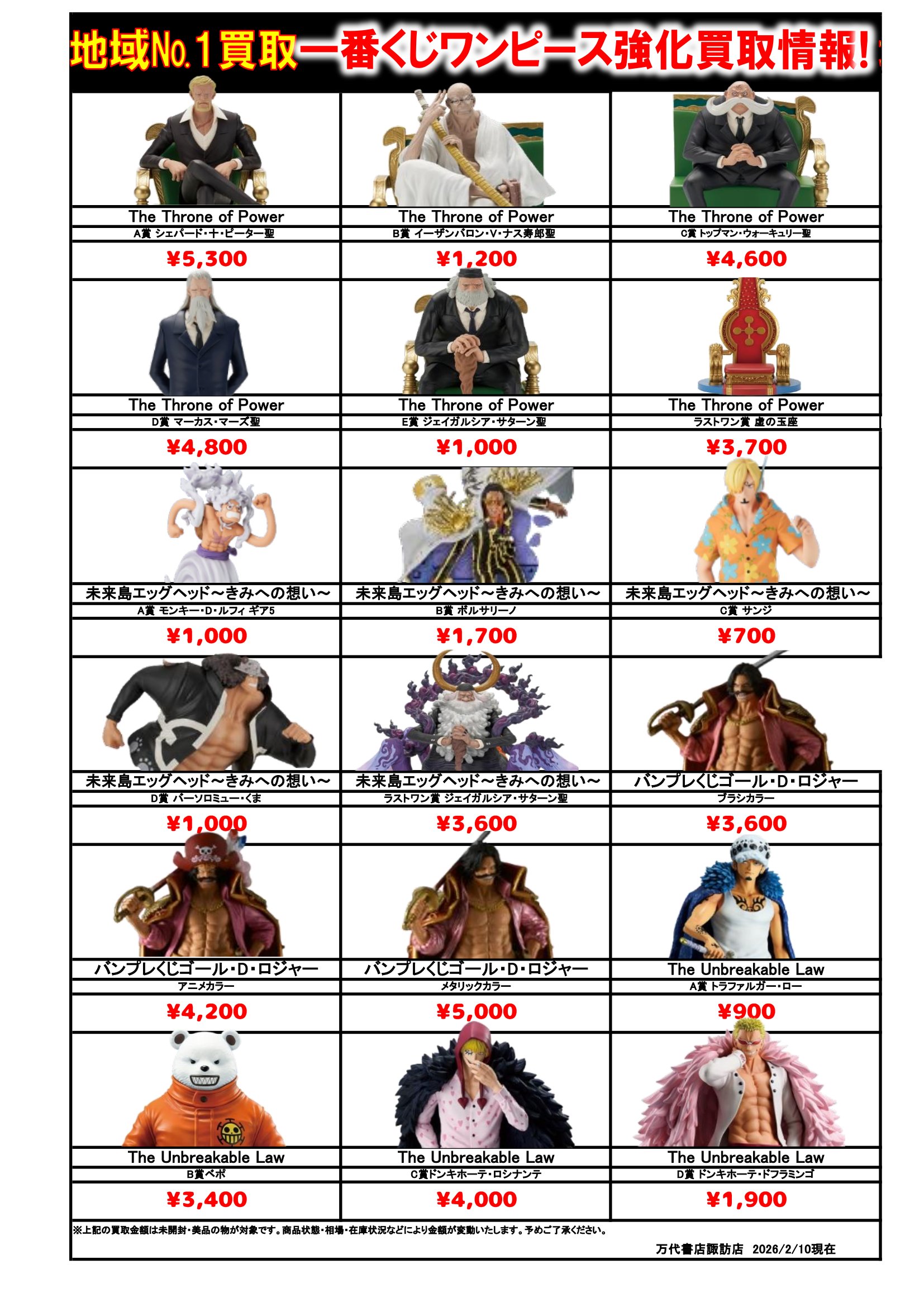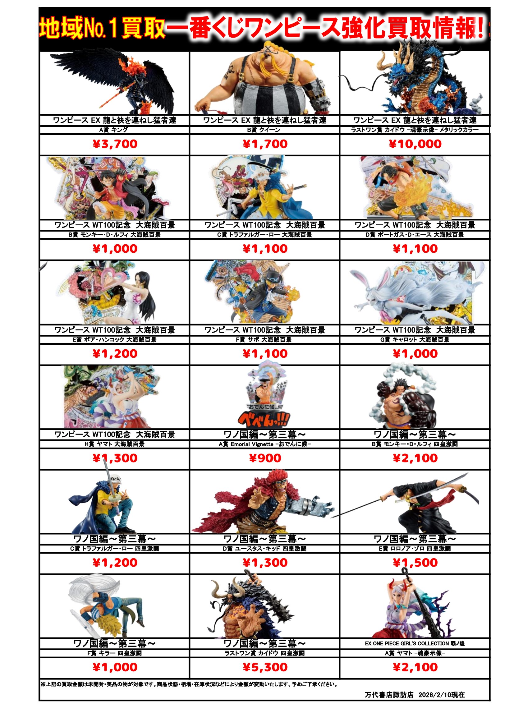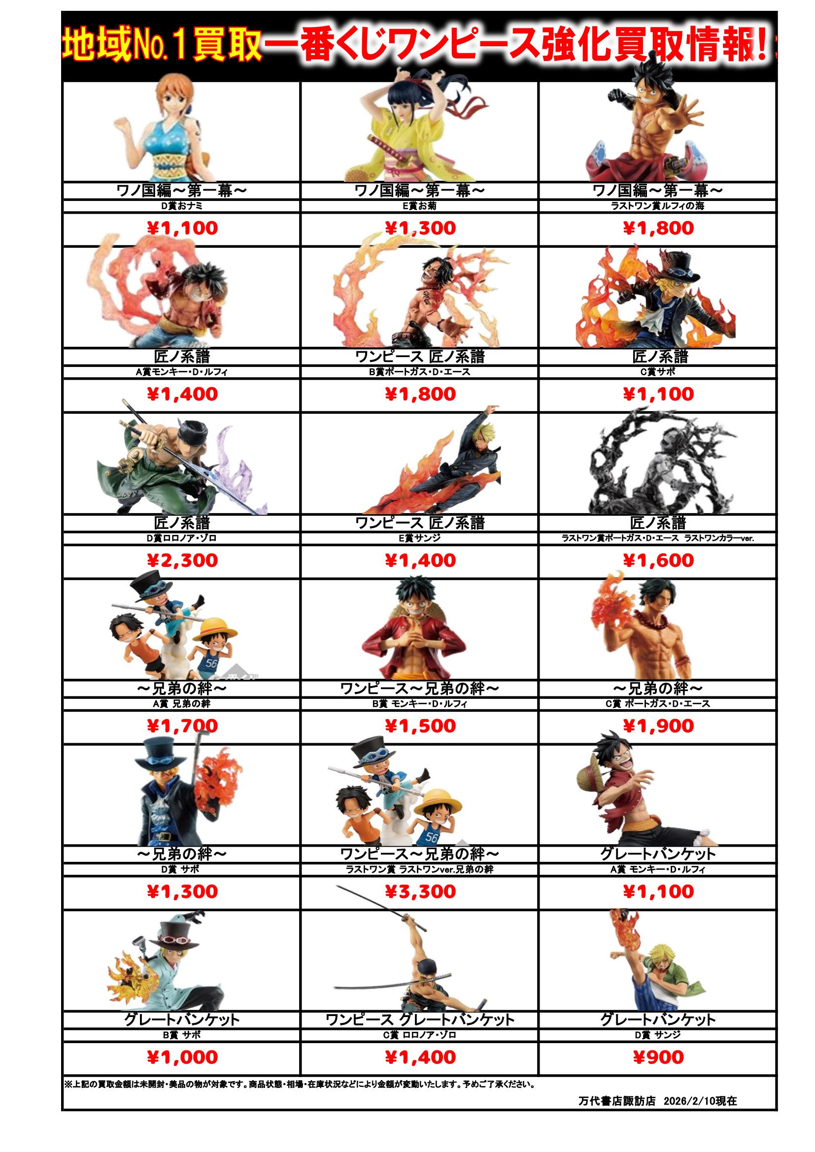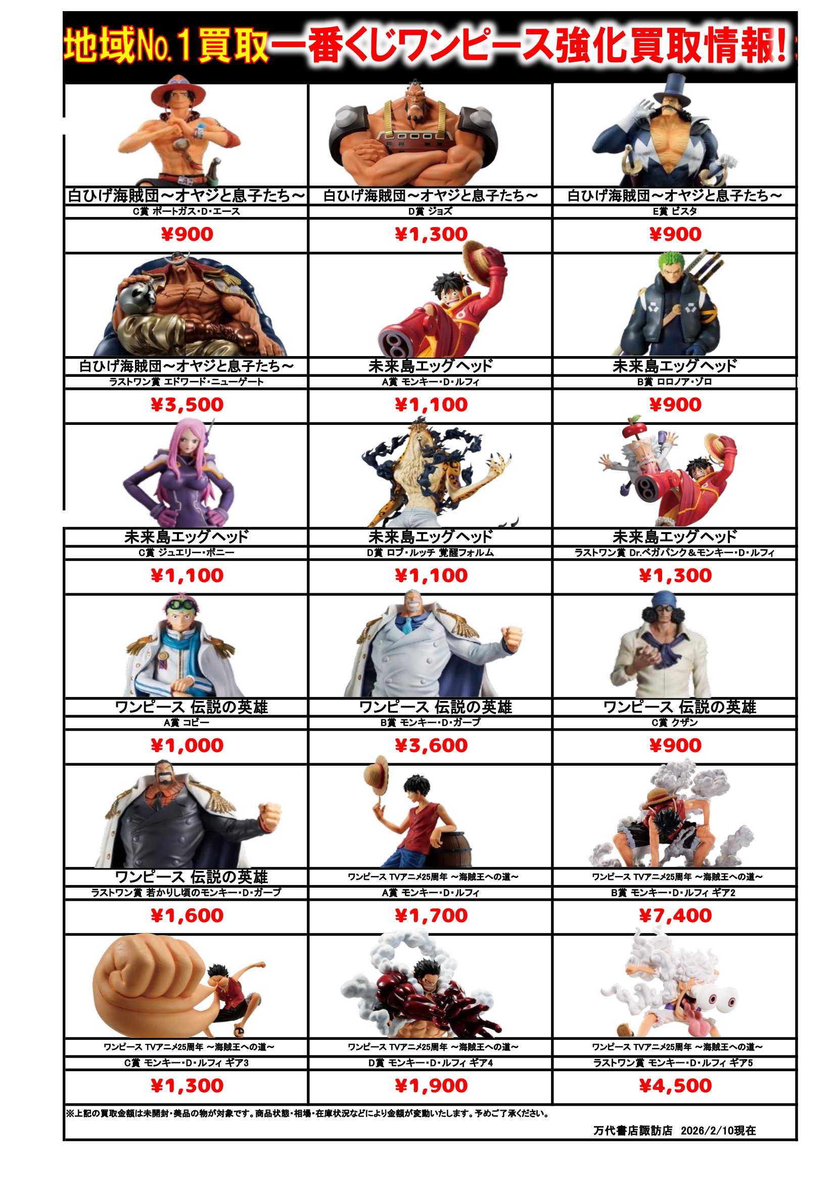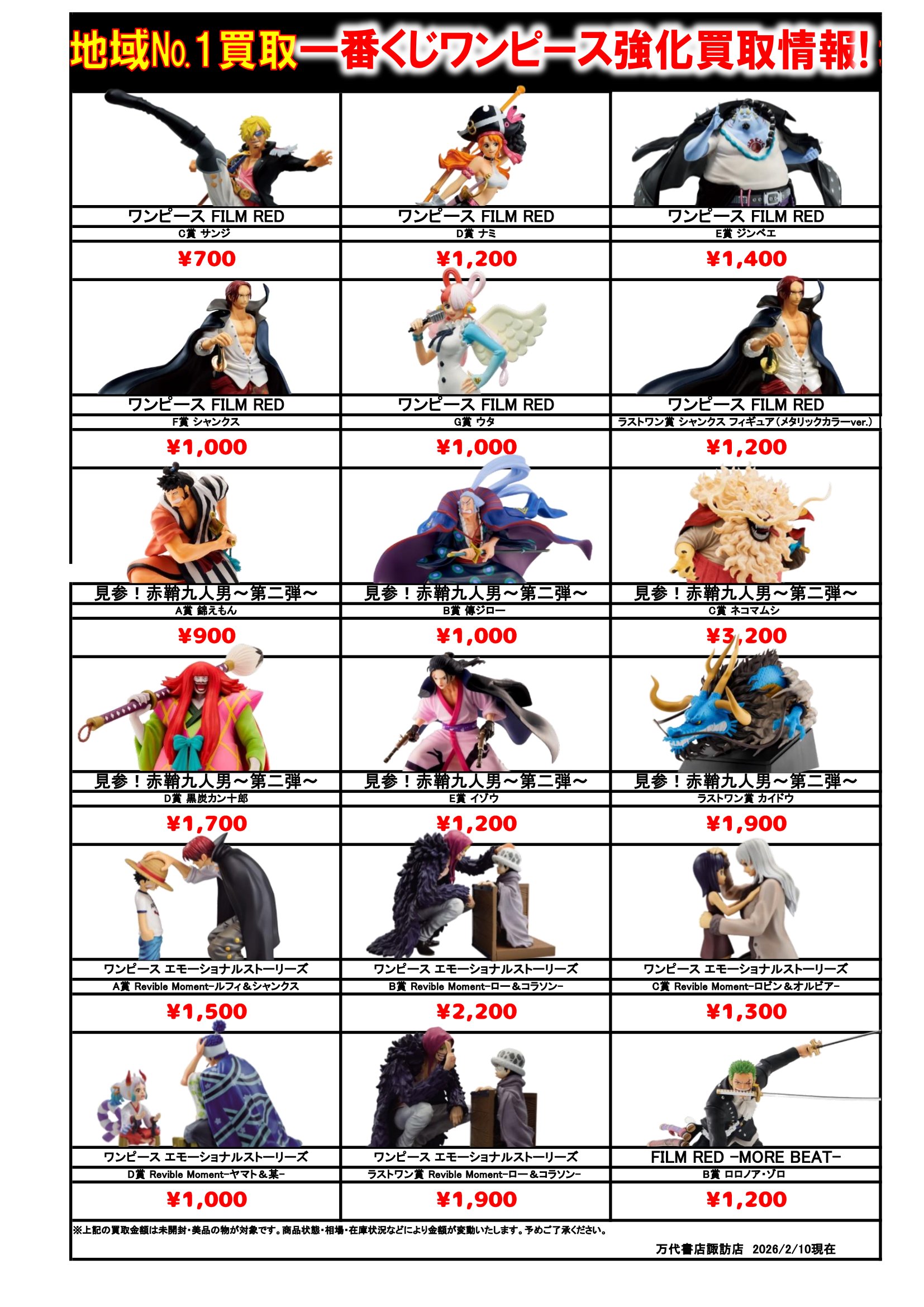 ドラゴンボール・ワンピース フィギュア WEBチラシ 2026/2/10 更新 フィギュアはこちら プライズフィギュアはこちら 美少女フィギュアはこちら チラシの掲載金額は店頭買取時での参考価格となります。 【ワンピース】 【ドラゴンボール】