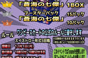 大会告知 ONE PIECE カード担当からお知らせです!📢 突然ですが! 12月1日月曜日に BOX争奪戦を開催します!! 優勝賞品には 『ブースターパック 蒼海の七傑 1BOX』 をご用意させていただ…