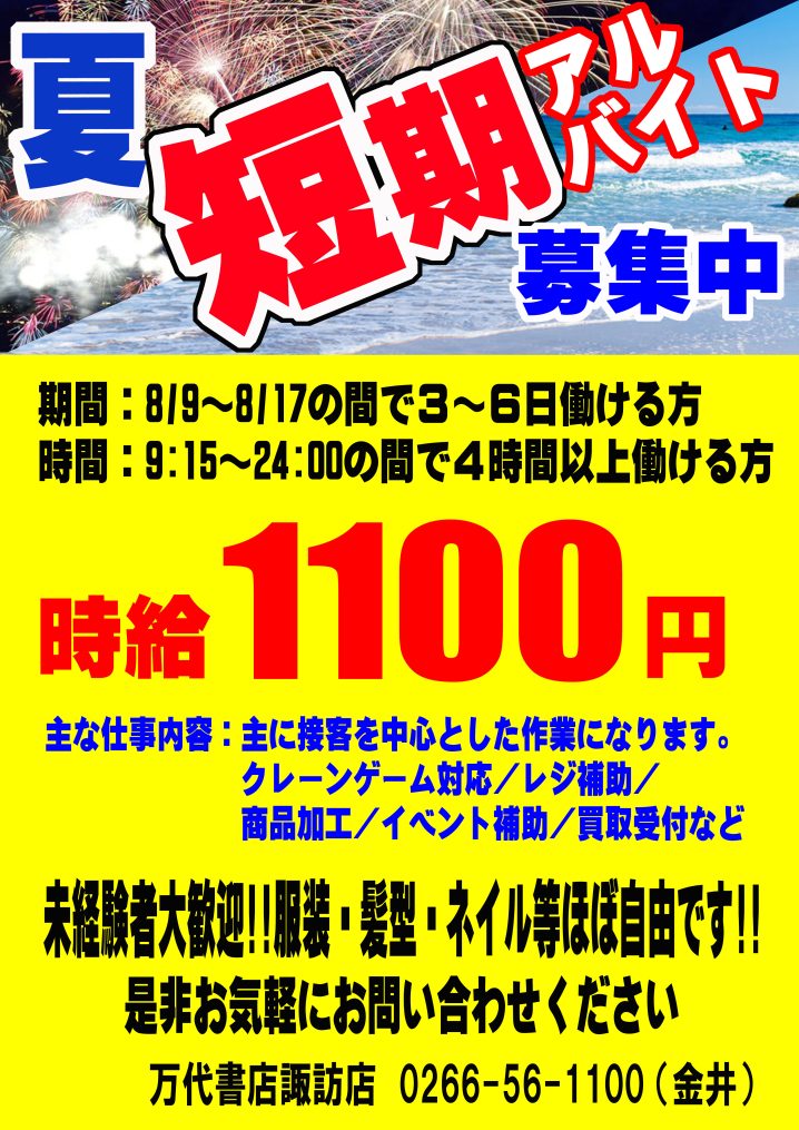 只今、短期アルバイトさんを募集しております。 ご都合が空いている方、いらしゃいましたら、ぜひご応募ください!