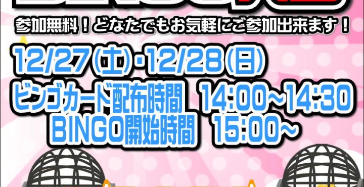 2025年最後のイベントは、 【BINGO大会】‼️‼️ 開催場所:1階フロア 開催日程:12/27(土)・12/28(日) ビンゴカード配布時間:14:00~1…
