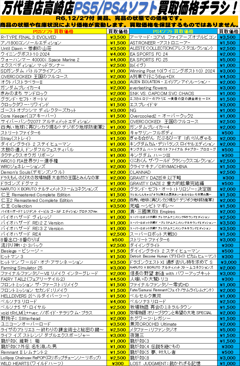 2024.12.27 緊急買取告知! takalab_2 ★PS5・PS4ソフト買取告知です!★ ★買取情報★ ※2024/12/27現在の価格となります。 在庫状況・状態によってお値段が変動いたします。予めご了承ください。 ⇩その他買取情報はこちら⇩ ★万代書店高崎店WEBチラシ★ ⇩最新のイベント情報はこちら⇩ ★万代書店高崎店イベントカレンダー★ コメントを残す コメントをキャンセルメールアドレスが公開されることはありません。 ※ が付いている欄は必須項目ですコメント ※ 名前 ※ メール ※ サイト 新しいコメントをメールで通知 新しい投稿をメールで受け取る Δ