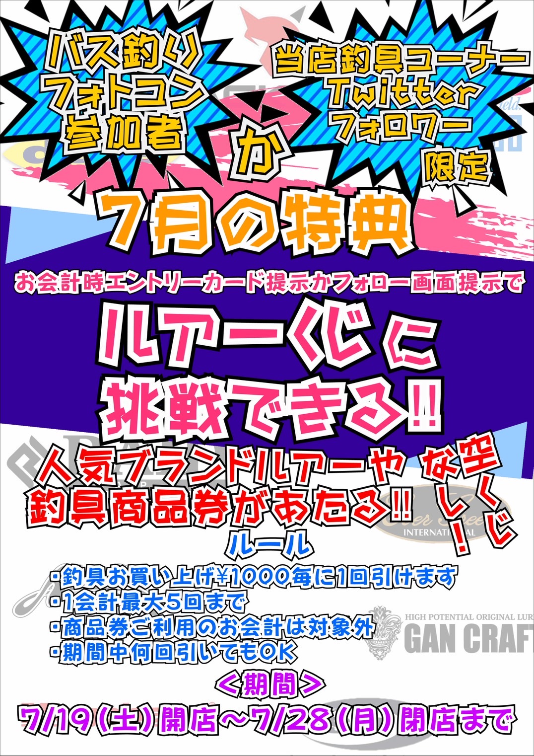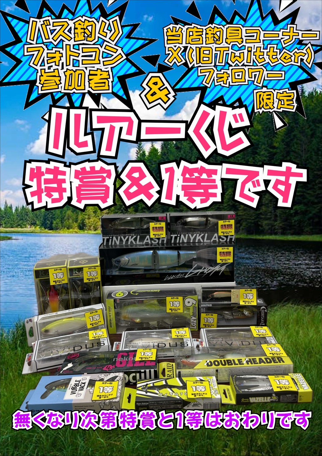 お買い上げ¥1000毎に1回チャレンジ出来て、ハズレちゃっても引いたルアーをそのままGETできちゃいます😊