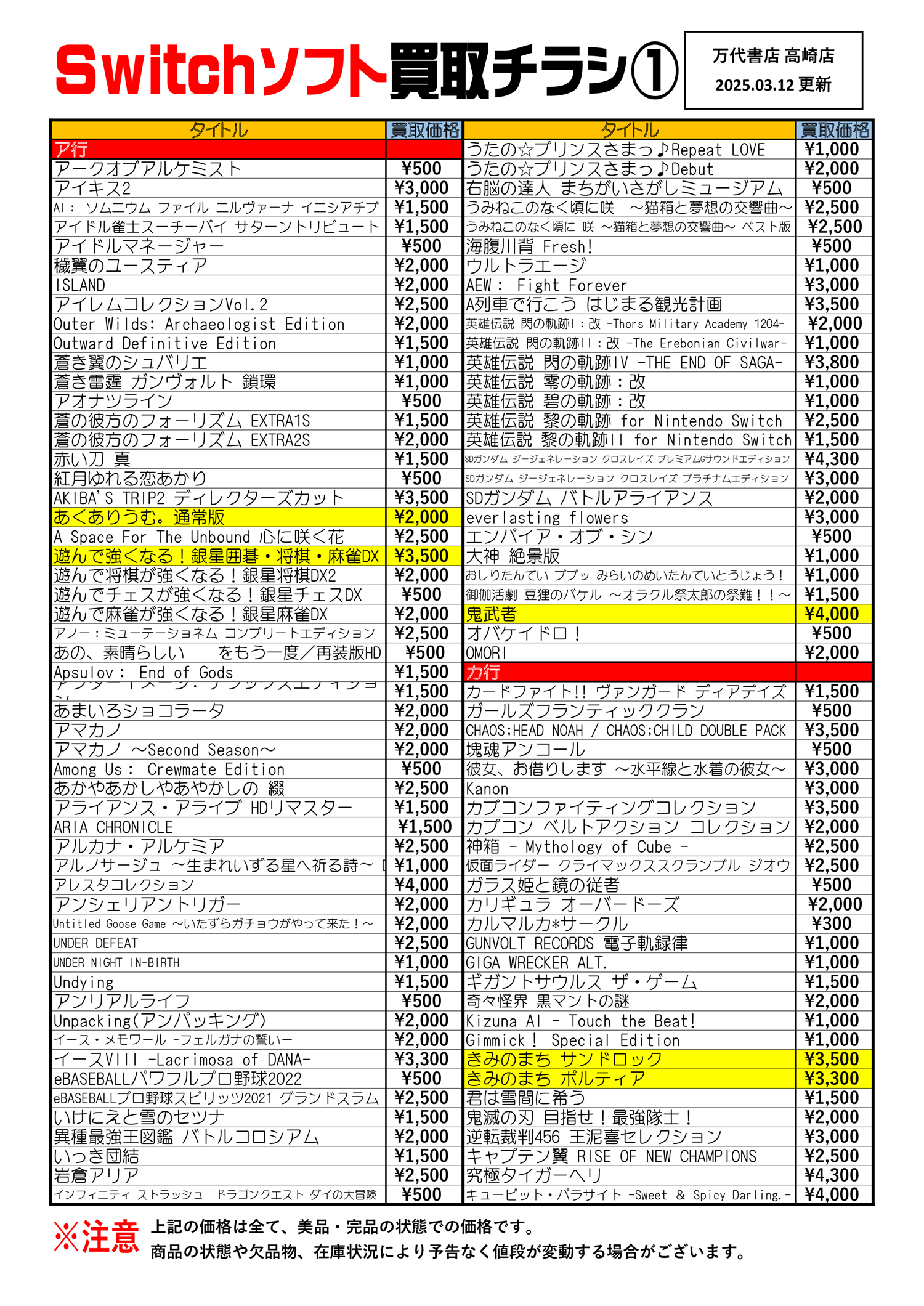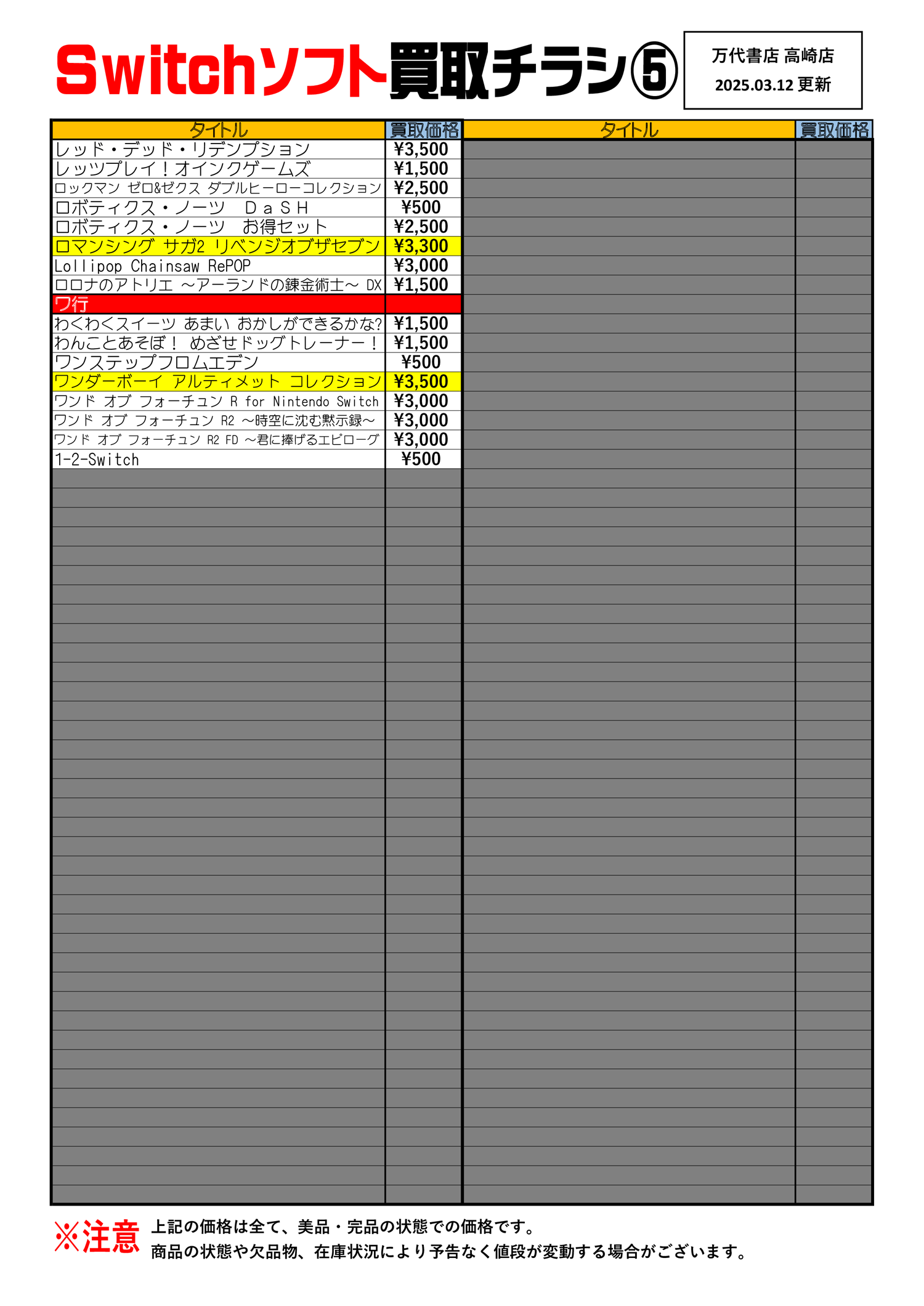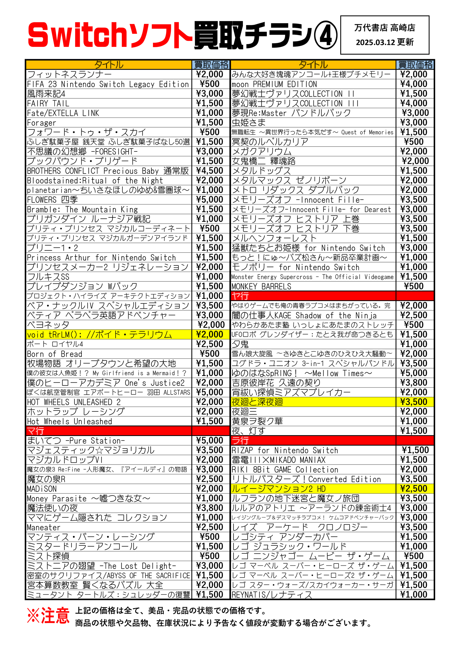 2025.03.12 万代高崎 takalab_5 【R7.3.12更新】Switchソフト買取告知、最新作から旧作まで掲載中! ☆★Switchソフト買取告知、最新作から旧作まで掲載中!★☆ ※2025/3/12 現在の価格となります。 在庫状況・状態によってお値段が変動いたします。予めご了承ください。 ⇩その他買取情報はこちら⇩ ★万代書店高崎店WEBチラシ★ ⇩最新のイベント情報はこちら⇩ ★万代書店高崎店イベントカレンダー★ コメントを残す コメントをキャンセルメールアドレスが公開されることはありません。 ※ が付いている欄は必須項目ですコメント ※ 名前 ※ メール ※ サイト 新しいコメントをメールで通知 新しい投稿をメールで受け取る Δ
