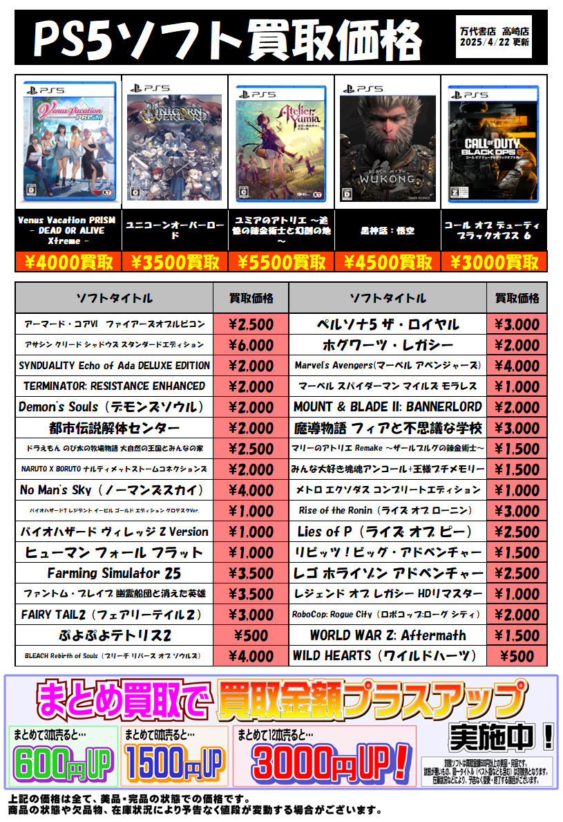 2025.04.22 緊急買取告知! takalab_2 ★PS5ソフト買取告知★ ★買取情報★ ※2025/4/22現在の価格となります。 在庫状況・状態によってお値段が変動いたします。予めご了承ください。 ************************************** ⇩その他買取情報はこちら⇩ ★万代書店高崎店WEBチラシ★ ⇩最新のイベント情報はこちら⇩ ★万代書店高崎店イベントカレンダー★ コメントを残す コメントをキャンセルメールアドレスが公開されることはありません。 ※ が付いている欄は必須項目ですコメント ※ 名前 ※ メール ※ サイト 新しいコメントをメールで通知 新しい投稿をメールで受け取る Δ