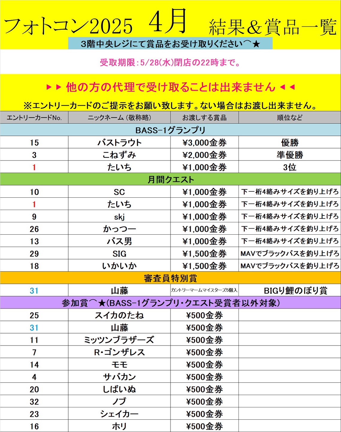 2025.05.02 万代高崎 takalab_4 バス釣りフォトコン 4月の結果発表ですぅー❗️ バス釣りフォトコン 4月の結果発表ですぅー❗️ 25年初戦から50アップ連発の激戦となりましたー✨ クエストクリアもおめでとうございます❗️ この調子で今月もどしどしご投稿お願いいたします😊 賞品の受取期限は5/28まで ご新規エントリーも大歓迎でお待ちしてまーす^_^ ************************************** ⇩その他買取情報はこちら⇩ ★万代書店高崎店WEBチラシ★ ⇩最新のイベント情報はこちら⇩ ★万代書店高崎店イベントカレンダー★ コメントを残す コメントをキャンセルメールアドレスが公開されることはありません。 ※ が付いている欄は必須項目ですコメント ※ 名前 ※ メール ※ サイト 新しいコメントをメールで通知 新しい投稿をメールで受け取る Δ