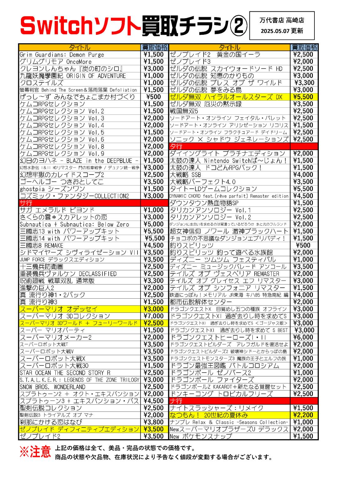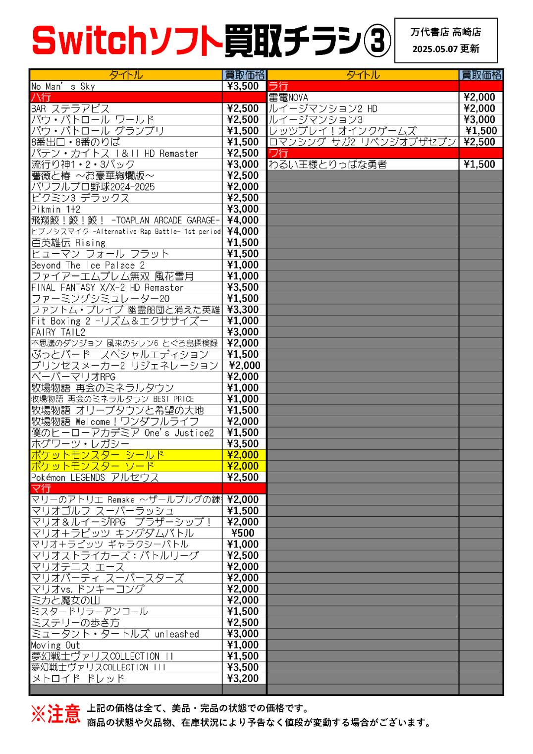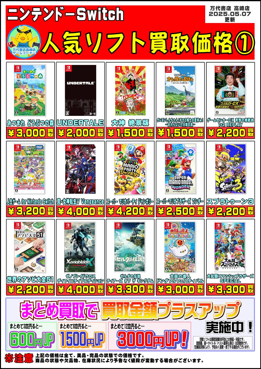 2025.05.08 万代高崎 takalab_6 【R7.5.7更新】Switchソフト買取告知、最新作から旧作まで掲載中! ★買取情報★ ※2025/5/8現在の価格となります。 在庫状況・状態によってお値段が変動いたします。予めご了承ください。 ************************************** ⇩その他買取情報はこちら⇩ ★万代書店高崎店WEBチラシ★ ⇩最新のイベント情報はこちら⇩ ★万代書店高崎店イベントカレンダー★ コメントを残す コメントをキャンセルメールアドレスが公開されることはありません。 ※ が付いている欄は必須項目ですコメント ※ 名前 ※ メール ※ サイト 新しいコメントをメールで通知 新しい投稿をメールで受け取る Δ