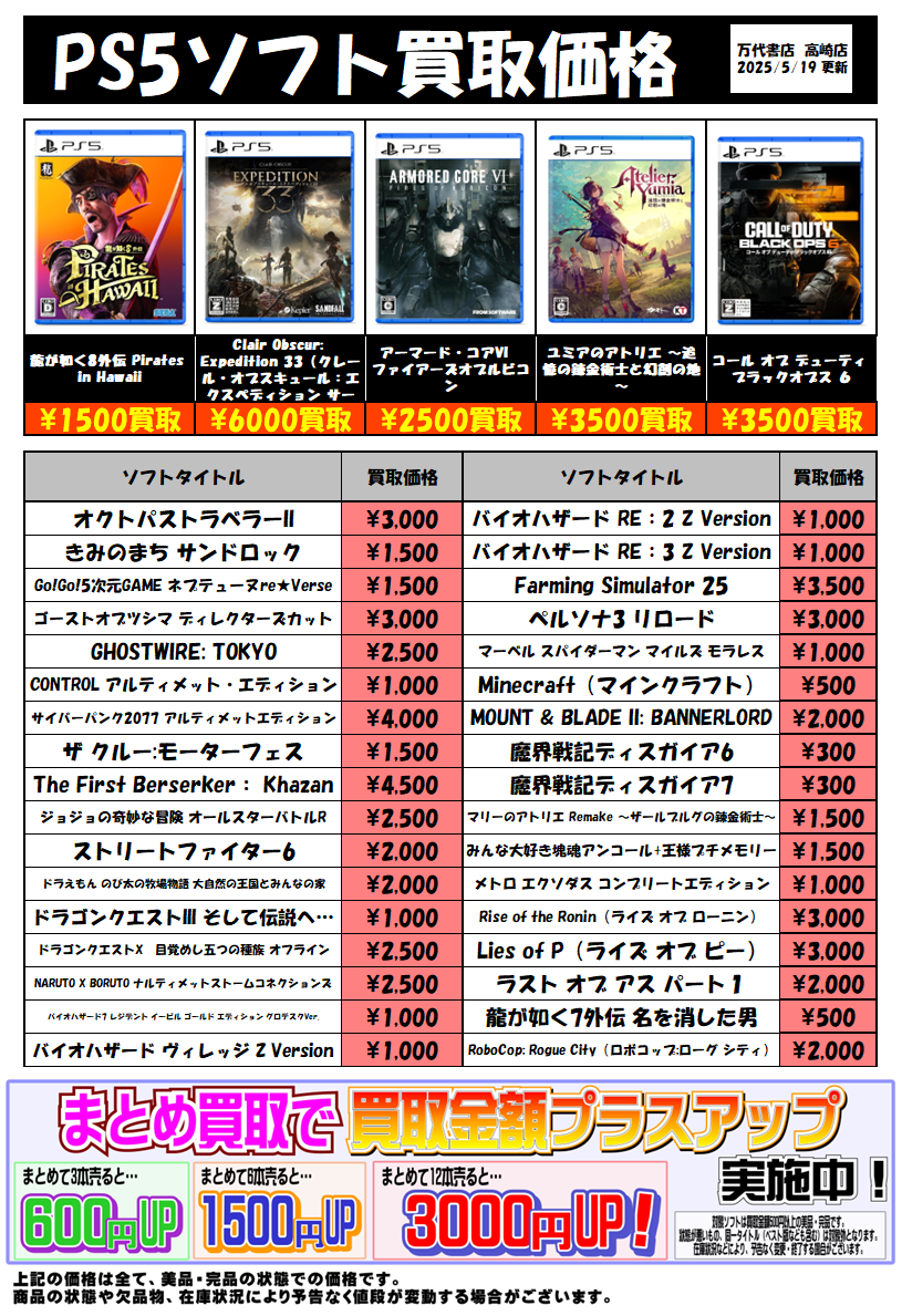 2025.05.19 万代高崎 takalab_6 ◆PS5ソフト買取チラシ更新しました!◆ 🎮買取情報 ※2025/5/19現在の価格となります。 在庫状況・状態によってお値段が変動いたします。予めご了承ください。 ************************************** ⇩その他買取情報はこちら⇩ ★万代書店高崎店WEBチラシ★ ⇩最新のイベント情報はこちら⇩ ★万代書店高崎店イベントカレンダー★ コメントを残す コメントをキャンセルメールアドレスが公開されることはありません。 ※ が付いている欄は必須項目ですコメント ※ 名前 ※ メール ※ サイト 新しいコメントをメールで通知 新しい投稿をメールで受け取る Δ
